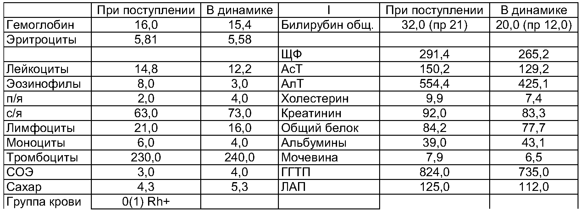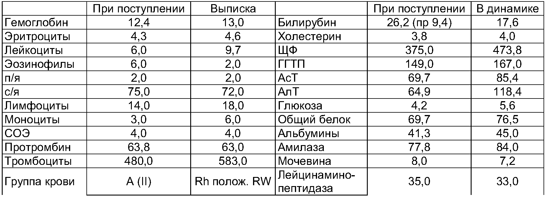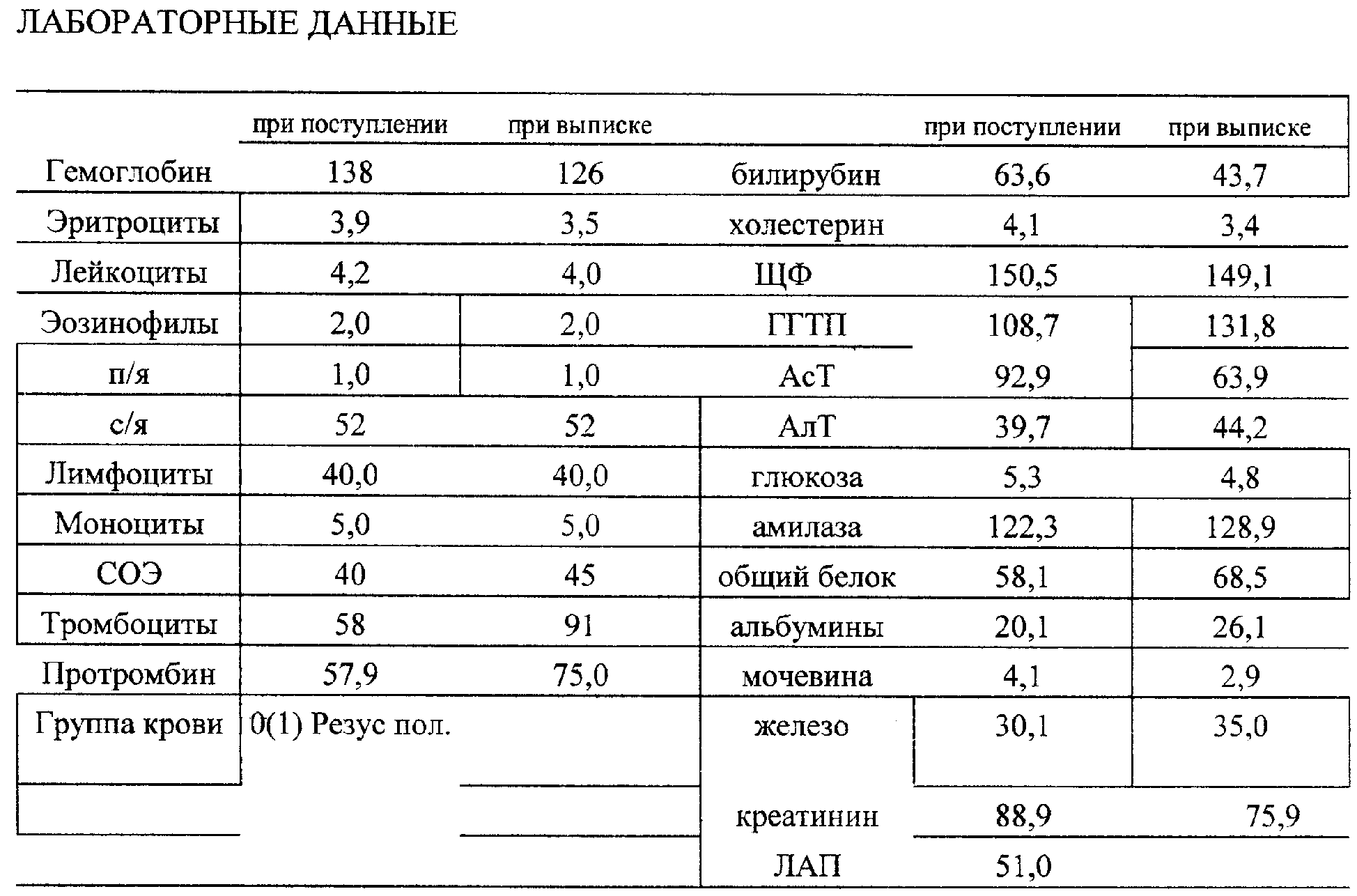 Общий анализ мочи: уд. вес 1017, белок, сахар – нет, лейкоциты – 4-5 в п/зр. Проводят диагностику внутрипеченочного холестаза при хронических заболеваниях печени, определяя соотношения гаммаглюгамилтранспептидазы к щелочной фосфатазе (ГГТП/ЩФ), гаммаглютамилтранспептидазы к лейцинаминопептидазе (ГГТП/ЛАП), щелочной фосфатазы к лейцинаминопептидазе (ЩФ/ЛАП) в сыворотке крови, и диагностируют внутрипеченочный холестаз у пациентов с лекарственным гепатитом при ГГТП/ЩФ больше 1, ГГТП/ЛАП меньше 4, ЩФ/ЛАП меньше 4. Пример 5 Больная М-на 48 лет поступила с диагнозом цирроз печени алкогольной этиологии активной субкомпенсированной, Чайлд-Пью А. Портальная гипертензия, асцит, спленомегалия. Варикозное расширение вен пищевода I степени. Хронический пакреатит, ремиссия. Артериальная гипертензия. При поступлении состояние удовлетворительное, жалобы на тяжесть в правом подреберье. Кожные покровы обычной окраски. В легких дыхание везикулярное, хрипов нет. ЧД 18 в мин. Тоны сердца нормальной звучности, ЧСС 74 в мин. АД 130/90 мм рт.ст. Живот мягкий, безболезненный. Печень увеличена на 2 см за счет правой доли, при пальпации плотная, селезенка не пальпируется. Дизурии нет. УЗИ. Небольшое количество свободной жидкости в брюшной полости; печень – размеры печени увеличены (толщина правой доли 139 мм, левой 78 мм), неравномерное повышение эхогенности, видимость сосудистых структур ослаблена. Желчный пузырь 6,6×2,3 см. Общий желчный проток (3 мм) и поджелудочная железа (24-16-12 мм) в пределах нормы. Эхогенность неравномерно повышена. Неровность контура. Размеры селезенки увеличены (площадь 79 см2). Калибр воротной вены 1,4 см, селезеночной 1,0 см. Заключение: диффузное поражение печени. Портальная гипертензия. Асцит. Хронический панкреатит. Сцинтиграфия печени. Положение печени относительно реберной дуги обычное. Форма печени не изменена. Контуры изображения ровные. Распределение радиофармпрепарата в печени диффузно-неравномерное. Селезенка визуализируется, расположение обычное. Заключение: Сцинтиграфические признаки диффузного поражения печени. ЛАБОРАТОРНЫЕ ДАННЫЕ
