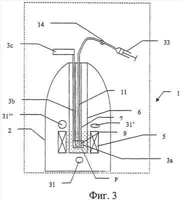 В третьем варианте осуществления изобретения аналитическое ЯМР оборудование может быть размещено в том же инструментальном средстве, что и поляризующий блок с блоком для растворения. Это показано на фиг.3, где показано множество катушек 31-31” для ЯМР-анализа, то есть катушек для ЯМР-визуализации и/или для ЯМР-спектроскопии. Катушки, которые могут использоваться для шиммирования магнитного поля и обнаружения ЯМР-сигнала, можно поместить в позиции, известные в технике ЯМР-анализа высокого разрешения. В этом случае блок для растворенного поляризованного материала представляет собой ту же самую чашку для образца, и время транспортировки равно нулю. Это предпочтительно, поскольку в этом случае при выполнении анализа, то есть при визуализации или спектроскопии, нет необходимости выносить образец из магнитного поля сверхпроводящего магнита. Кроме того, низкая рабочая температура катушек, погруженных в жидкий гелий, значительно (более чем в три раза) улучшает отношение сигнал/шум. Требования к величине магнитного поля для поляризации и для обнаружения ЯМР могут не совпадать, поэтому можно предусмотреть средства перемещения образца из одной части магнита в другую. Может оказаться предпочтительным осуществлять обнаружение ЯМР при большей или меньшей величине поля, чем оптимальная величина поля для динамической поляризации ядер. Поэтому в одном из вариантов осуществления изобретения динамическая поляризация ядер проводится в холодном газообразном гелии в нижней части магнита (то есть в менее сильном поле, например 3,35 Тл). В этом случае следует шиммировать поле в этой области для обеспечения требуемой однородности этого поля. После поляризации образца для его растворения и для обнаружения ЯМР образец можно поднять к центру магнита (где поле сильнее, например 9,4 Тл, и является однородным). Кроме того, для растворения образец можно поднять в промежуточное положение, а затем для обнаружения ЯМР переместить к центру магнита.