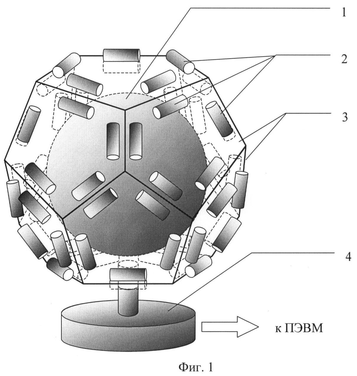 Устройство со сферической зоной обзора для поиска фотонных источников, содержащее детектирующий блок, включающий защитный экран и многоэлементный детектор, расположенный вокруг поверхности экрана, отличающееся тем, что оно содержит электронный преобразователь, соединенный с элементами детектора и блок электроники, соединенный с преобразователем, защитный экран выполнен в виде шара, а детекторы расположены по ребрам правильного многогранника, образованного платами электронного преобразователя.