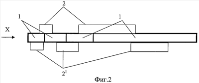 На Фиг.2 схематично представлен многослойный детектор, где: 1 – пластины сцинтилляторов, 2, 21 – фотоприемные устройства, расположенные на границах боковых поверхностей между смежными пластинами, X – направление излучения. Такое расположение фотоприемников позволяет уменьшить их количество.