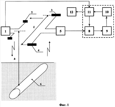 Шкала блока 11 регулируемой задержки связана с индикатором 12, который позволяет регистрировать измеренное значение глубины прокладки подводного трубопровода: