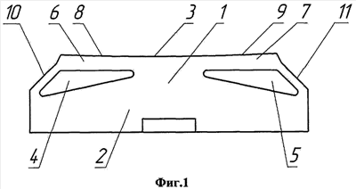 В качестве расчетных моделей были взяты два медных зеркала. Длина зеркал – 210 мм, ширина 30 мм, высота 59 мм. Апертура излучения (светового поля) зеркала 4×160 мм. Поглощенная световая нагрузка 230 Вт. Отличие одного зеркала – исходного от другого – заявляемого, заключалось в наличии прорезей, образующих балки 6 и 7 длиной 52 мм, сечением 12×30 мм, упругие перемычки 10 и 11 длиной 20 мм и сечением 6×30 мм. Угол наклона перемычек 45°. Зеркало охлаждалось водой с помощью четырех продольных каналов сечением 5×2 мм каждый. Расстояние от каналов охлаждения до отражающей поверхности 2 мм.
