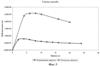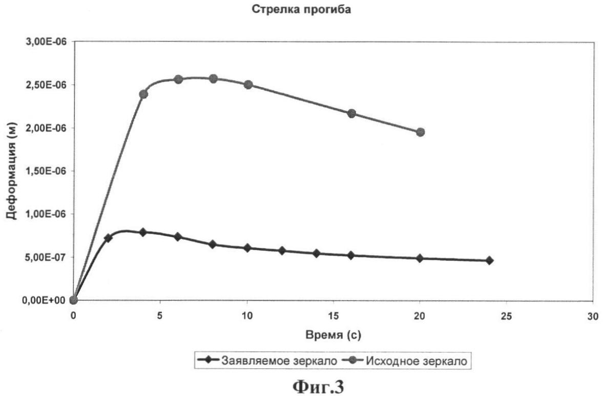 Динамическое изменение стрелки прогиба (Optical Path Difference – OPD), т.е. разница между двумя точками поверхности зеркала с наибольшей и наименьшей деформацией по длине с момента включения лазера для исходного зеркала и заявляемого, приведено на графике, фиг.3. По оси абсцисс отложено время от включения тепловой нагрузки на зеркало в секундах. По оси ординат – стрелка прогиба зеркала в мкм. Как видно из графика, максимальная деформация зеркала наблюдается на шестой секунде от включения, что соответствует расчетному значению, полученному с учетом расстояния от отражающей поверхности до каналов охлаждения по методике, предложенной в книге [Харитонов В.В. Теплофизика лазерных зеркал. – М.: Машиностроение, 1993].