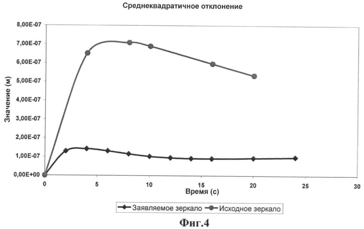 На фиг.4 приведен график среднеквадратичного отклонения (RMS OPD) стрелки прогиба поверхности зеркала, рассчитанного по следующей формуле: