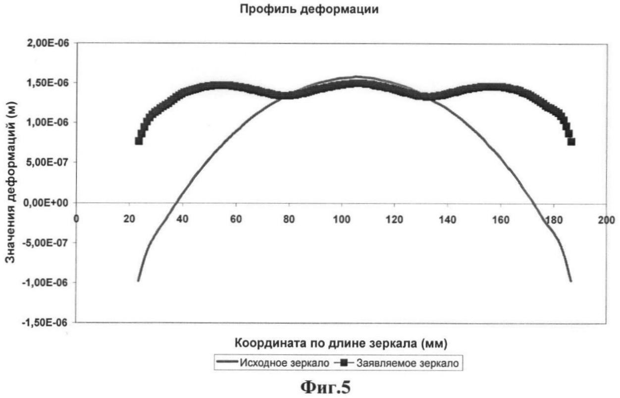 Профили деформации зеркал, соответствующей максимальной деформации, приведены на фиг.5. По оси абсцисс отложена координата зеркала по длине апертуры в миллиметрах, ось ординат – это тепловая деформация зеркала в метрах, значение изменения положения точки на поверхности из-за тепловой деформации. Как видно из графика, центральная зона, поверхности 3, фиг.1, у исходного зеркала и зеркала с прорезями практически одинакова. Но участки отражающей поверхности 8 и 9 деформируются значительно меньше, чем у зеркала без прорезей.