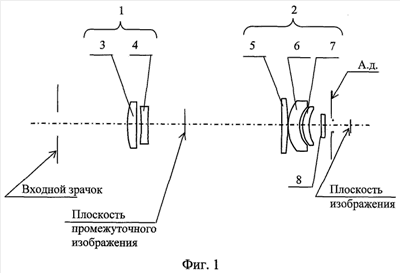 Дополнительно можно отметить, что большая величина удаления входного зрачка позволяет обеспечить излом оптической оси перед объективом, что бывает необходимо при конструктивной компоновке малогабаритных приборов. Расстояние между объективом 1 и проекционным объективом 2 таково, что позволяет устанавливать, например, призменные системы для использования оптической системы в панорамических приборах или дополнительные зеркала для излома оптической оси.