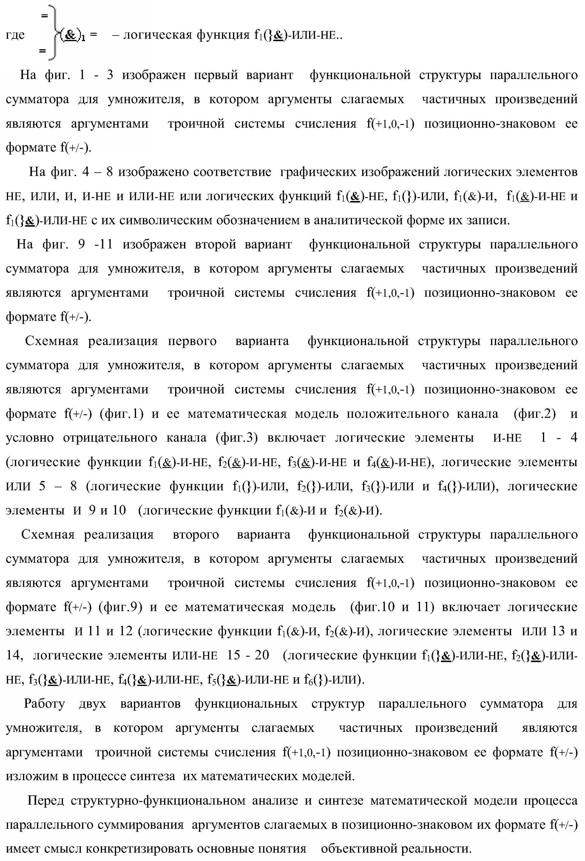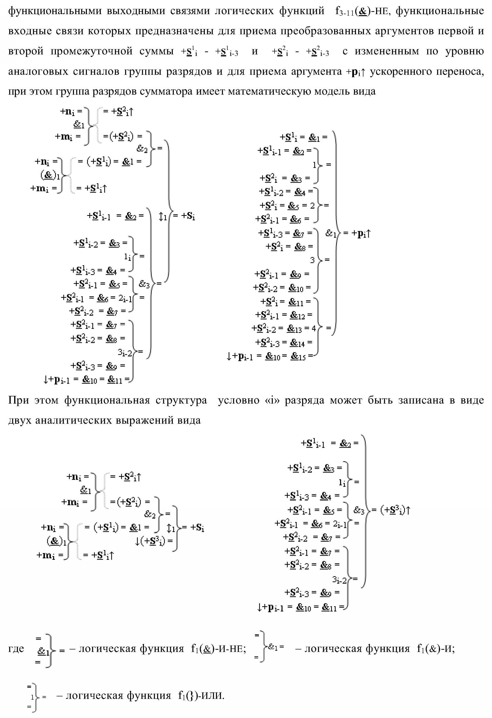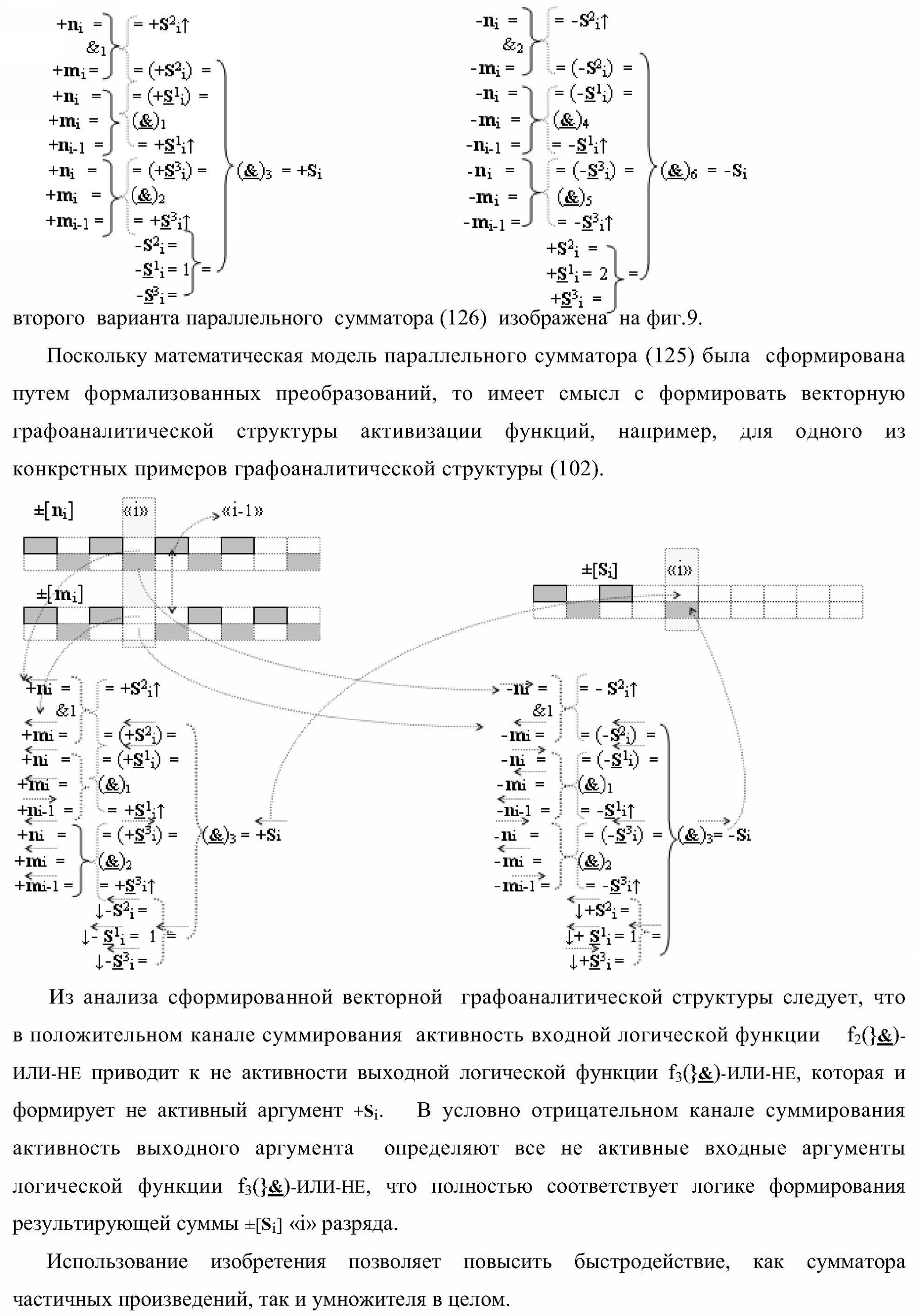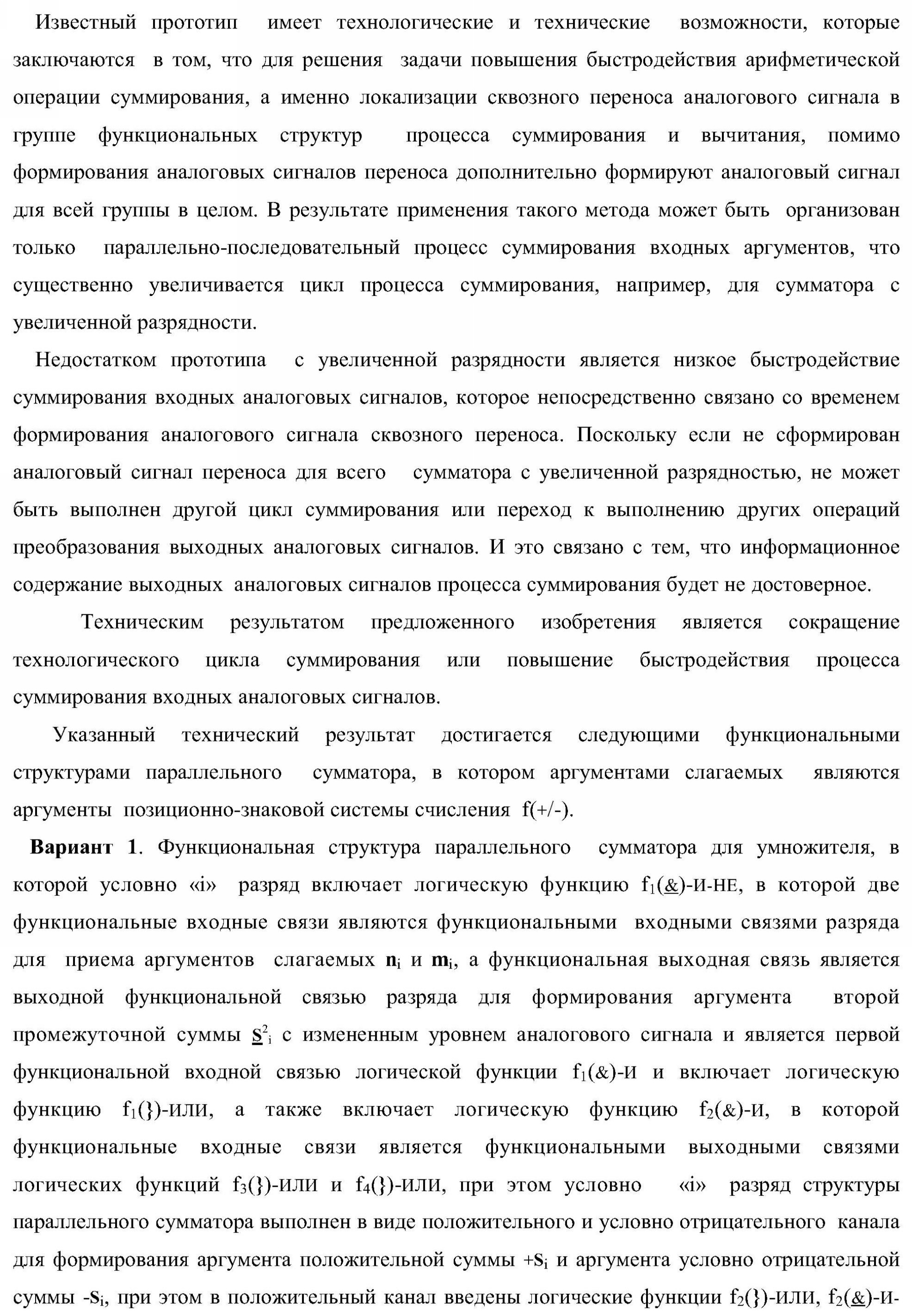 1. Функциональная структура параллельного сумматора для умножителя, в которой условно «i» разряд включает логическую функцию f1(&)-И-HE, в которой две функциональные входные связи являются функциональными входными связями разряда для приема аргументов слагаемых ni и mi, a функциональная выходная связь является выходной функциональной связью разряда для формирования аргумента второй промежуточной суммы S2 i с измененным уровнем аналогового сигнала и является первой функциональной входной связью логической функции f1(&)-И и включает логическую функцию f1(})-ИЛИ, а также включает логическую функцию f2(&)-И, в которой функциональные входные связи являются функциональными выходными связями логических функций f3(})-ИЛИ и f4(})-ИЛИ, отличающаяся тем, что условно «i» разряд структуры параллельного сумматора выполнен в виде положительного и условно отрицательного канала для формирования аргумента положительной суммы +Si и аргумента условно отрицательной суммы -Si, при этом в положительный канал введены логические функции f2(})-ИЛИ, f2(&)-И-НЕ, а в условно отрицательный канал введены логические функции f3(&)-И-НЕ и f4(&)-И-НЕ, при этом функциональные связи логических функций в структуре сумматора выполнены в соответствии с математической моделью вида