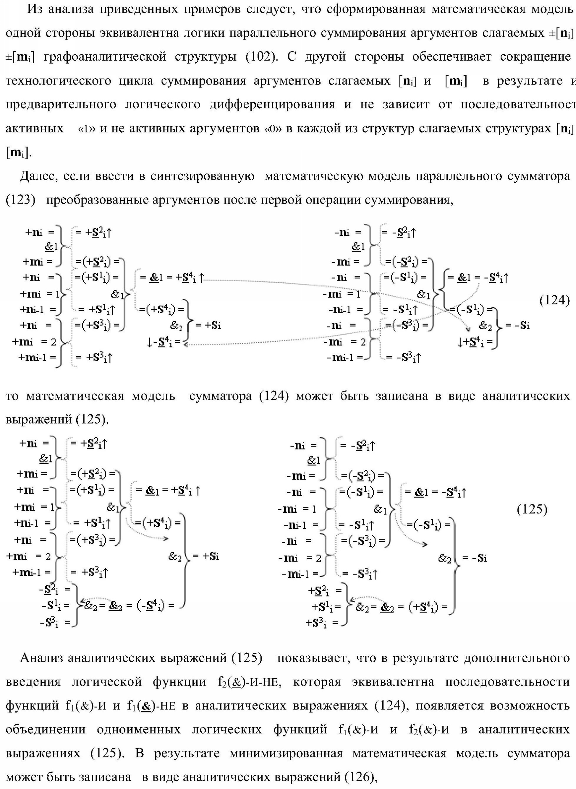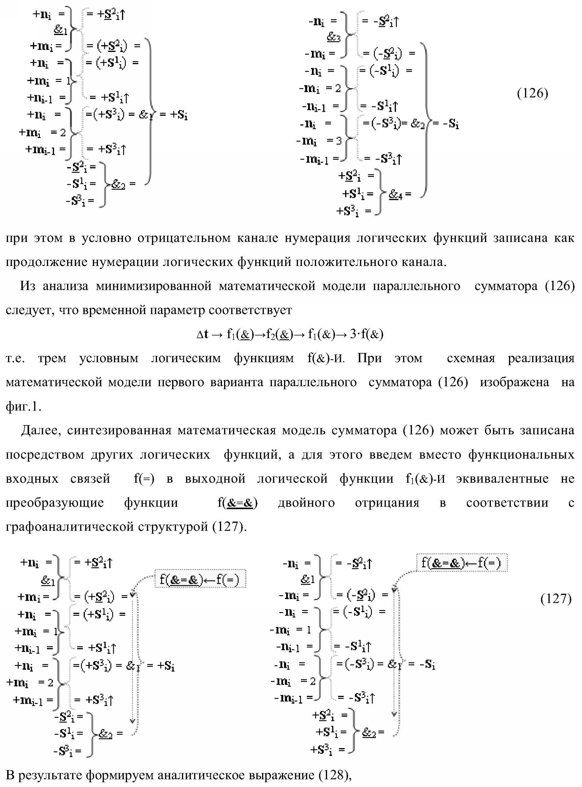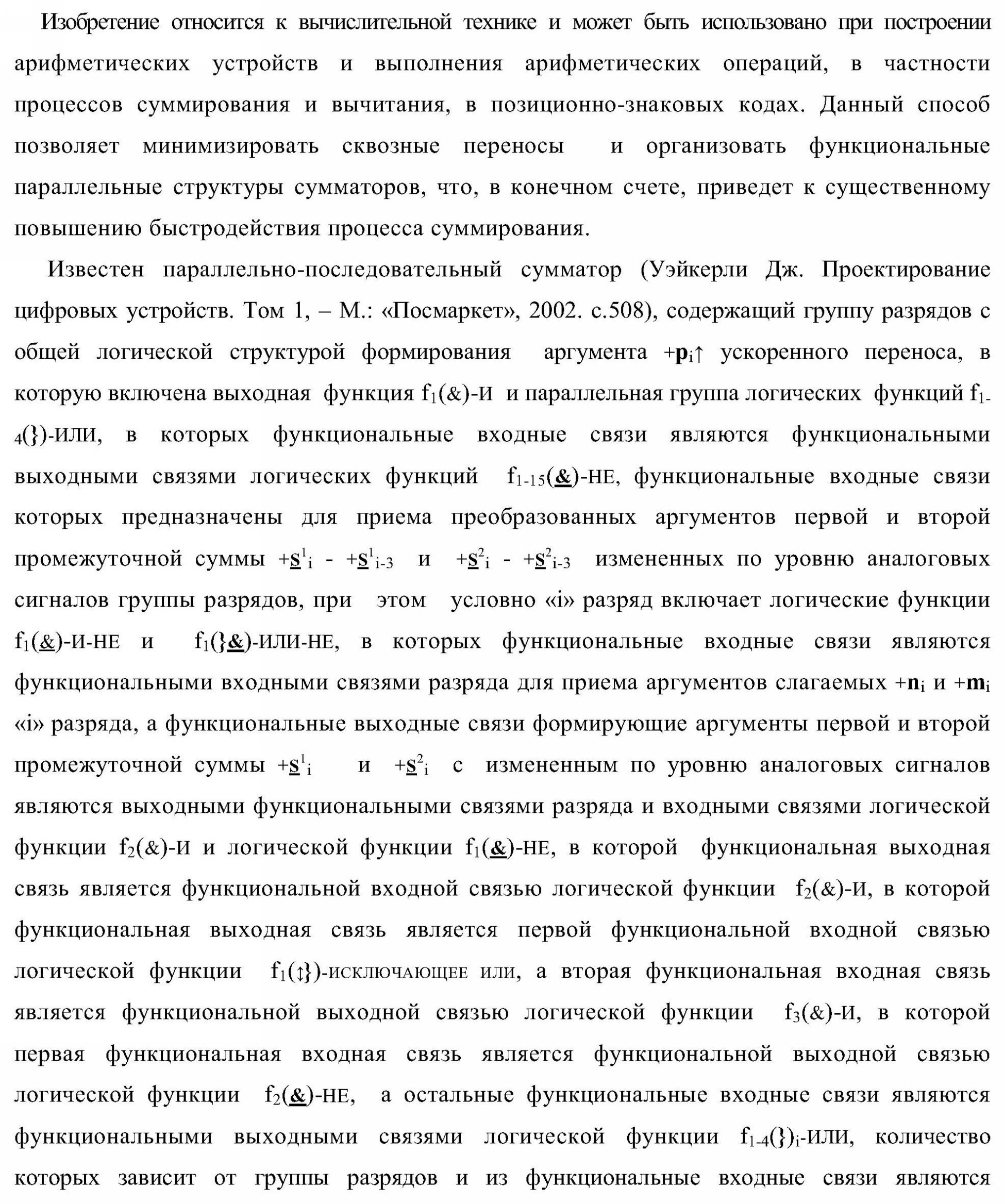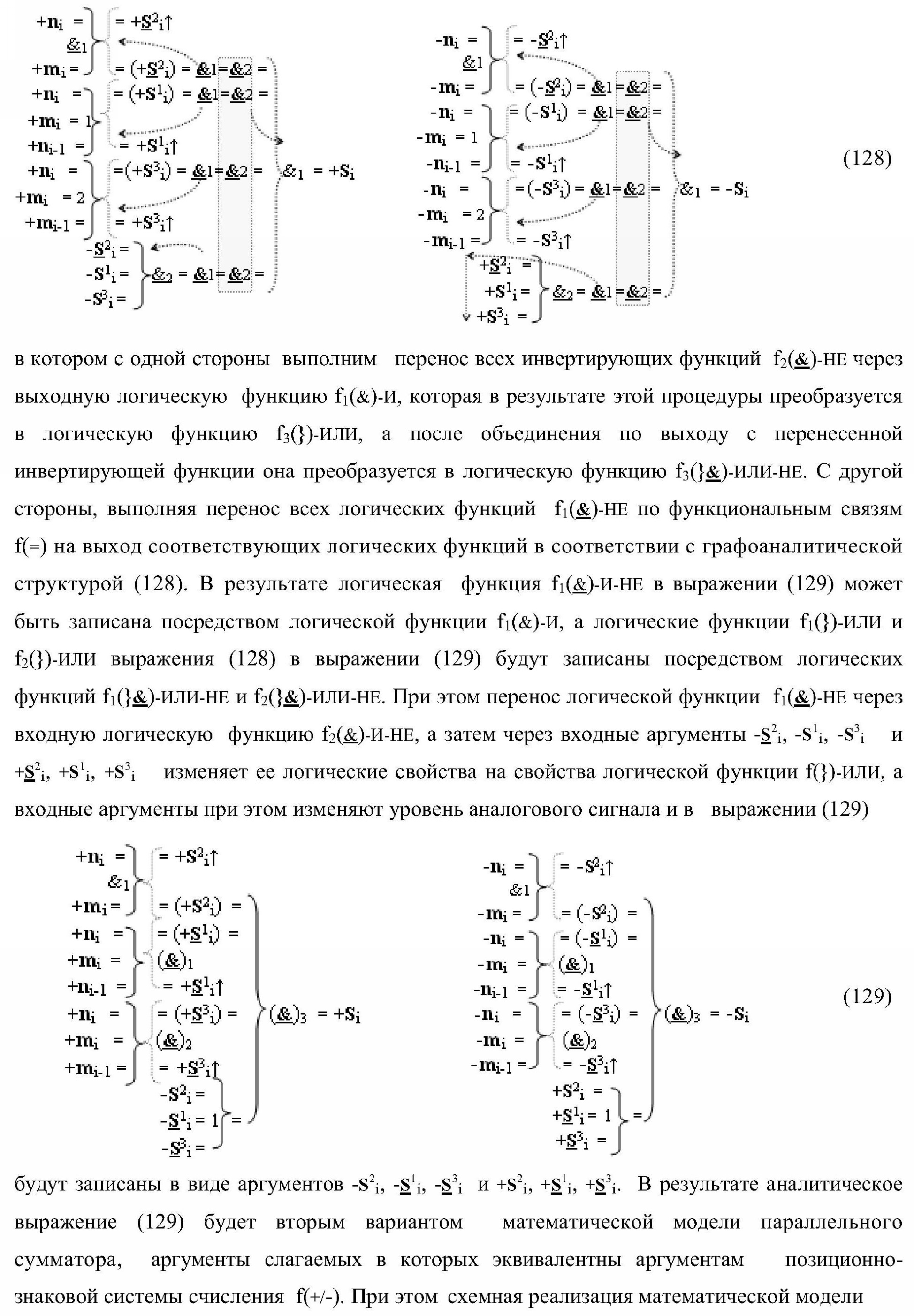 1. Функциональная структура параллельного сумматора для умножителя, в которой условно «i» разряд включает логическую функцию f1(&)-И-HE, в которой две функциональные входные связи являются функциональными входными связями разряда для приема аргументов слагаемых ni и mi, a функциональная выходная связь является выходной функциональной связью разряда для формирования аргумента второй промежуточной суммы S2 i с измененным уровнем аналогового сигнала и является первой функциональной входной связью логической функции f1(&)-И и включает логическую функцию f1(})-ИЛИ, а также включает логическую функцию f2(&)-И, в которой функциональные входные связи являются функциональными выходными связями логических функций f3(})-ИЛИ и f4(})-ИЛИ, отличающаяся тем, что условно «i» разряд структуры параллельного сумматора выполнен в виде положительного и условно отрицательного канала для формирования аргумента положительной суммы +Si и аргумента условно отрицательной суммы -Si, при этом в положительный канал введены логические функции f2(})-ИЛИ, f2(&)-И-НЕ, а в условно отрицательный канал введены логические функции f3(&)-И-НЕ и f4(&)-И-НЕ, при этом функциональные связи логических функций в структуре сумматора выполнены в соответствии с математической моделью вида