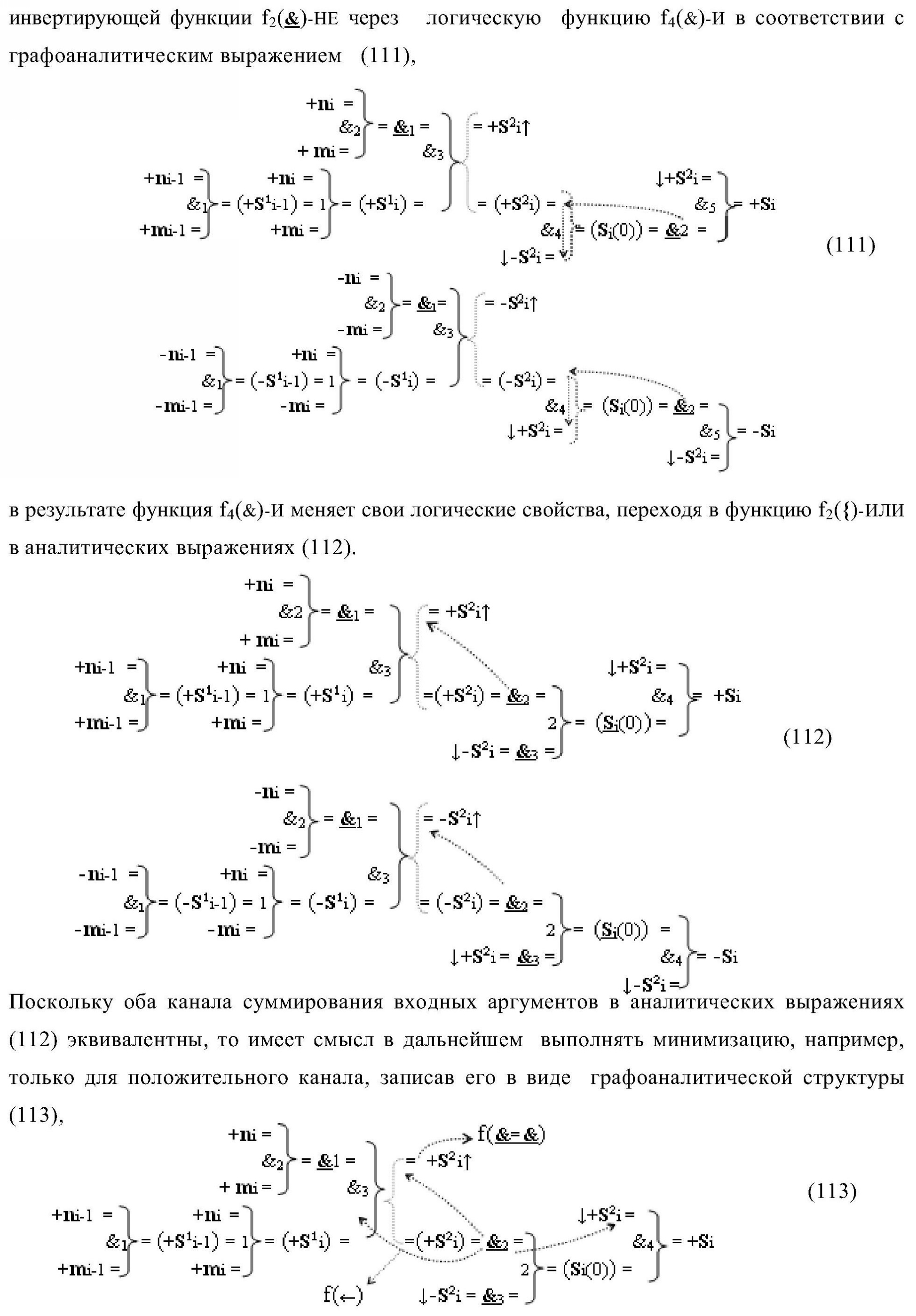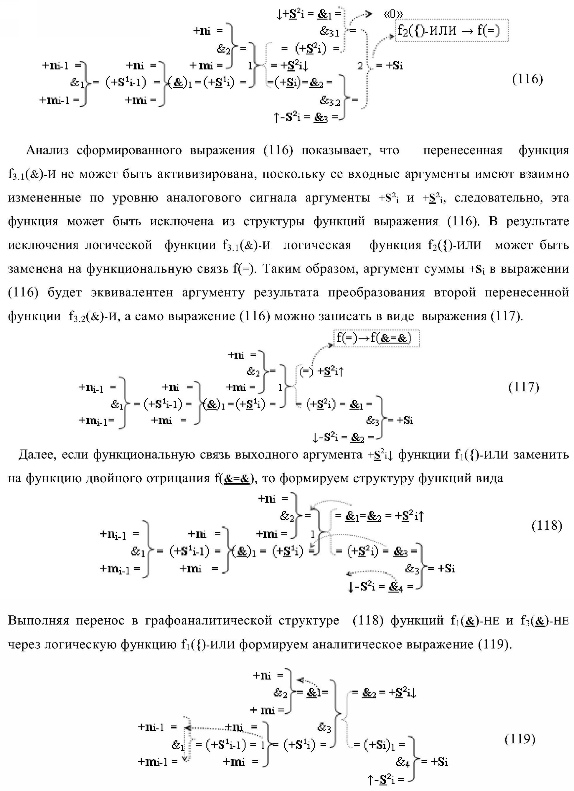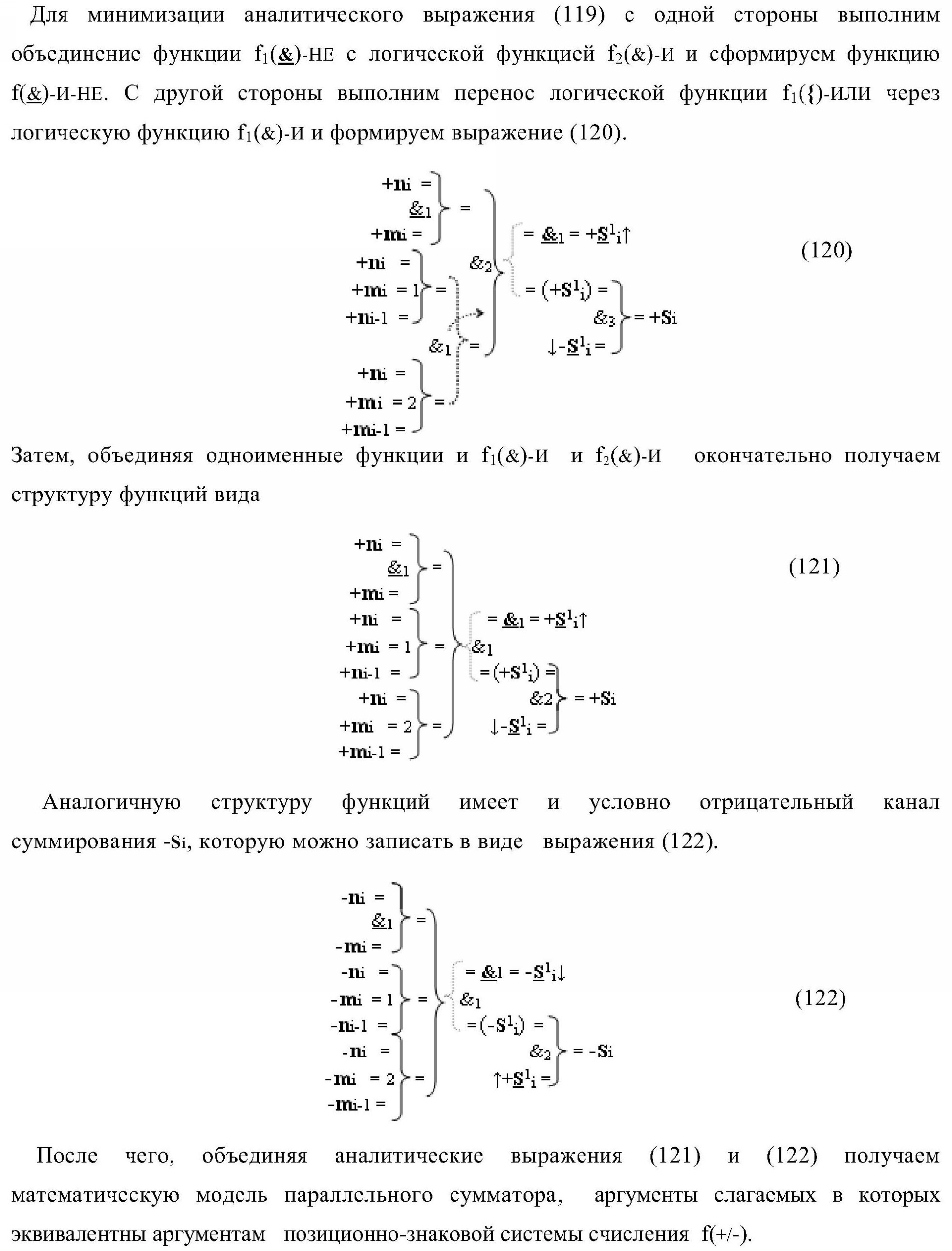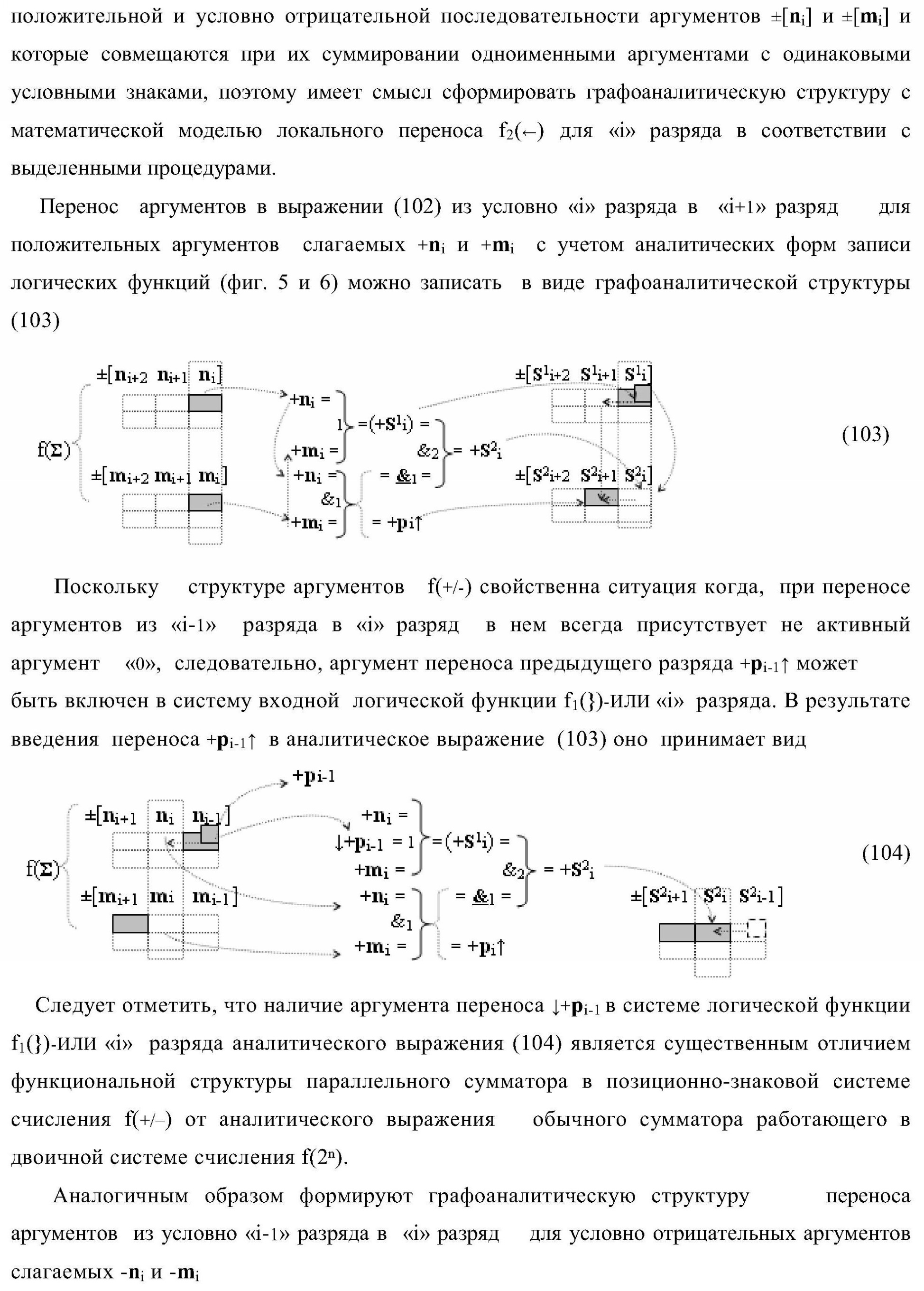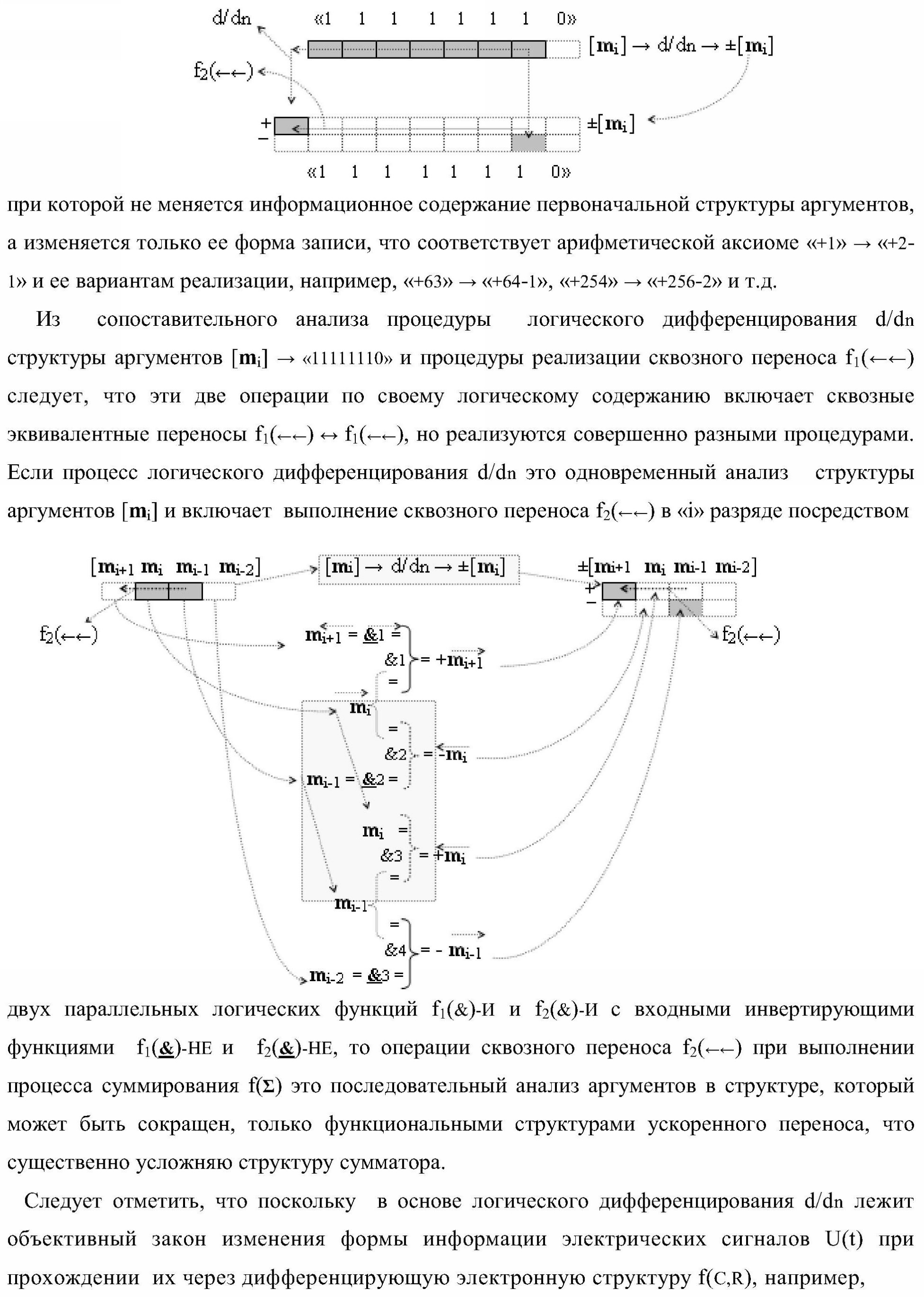 1. Функциональная структура параллельного сумматора для умножителя, в которой условно «i» разряд включает логическую функцию f1(&)-И-HE, в которой две функциональные входные связи являются функциональными входными связями разряда для приема аргументов слагаемых ni и mi, a функциональная выходная связь является выходной функциональной связью разряда для формирования аргумента второй промежуточной суммы S2 i с измененным уровнем аналогового сигнала и является первой функциональной входной связью логической функции f1(&)-И и включает логическую функцию f1(})-ИЛИ, а также включает логическую функцию f2(&)-И, в которой функциональные входные связи являются функциональными выходными связями логических функций f3(})-ИЛИ и f4(})-ИЛИ, отличающаяся тем, что условно «i» разряд структуры параллельного сумматора выполнен в виде положительного и условно отрицательного канала для формирования аргумента положительной суммы +Si и аргумента условно отрицательной суммы -Si, при этом в положительный канал введены логические функции f2(})-ИЛИ, f2(&)-И-НЕ, а в условно отрицательный канал введены логические функции f3(&)-И-НЕ и f4(&)-И-НЕ, при этом функциональные связи логических функций в структуре сумматора выполнены в соответствии с математической моделью вида
