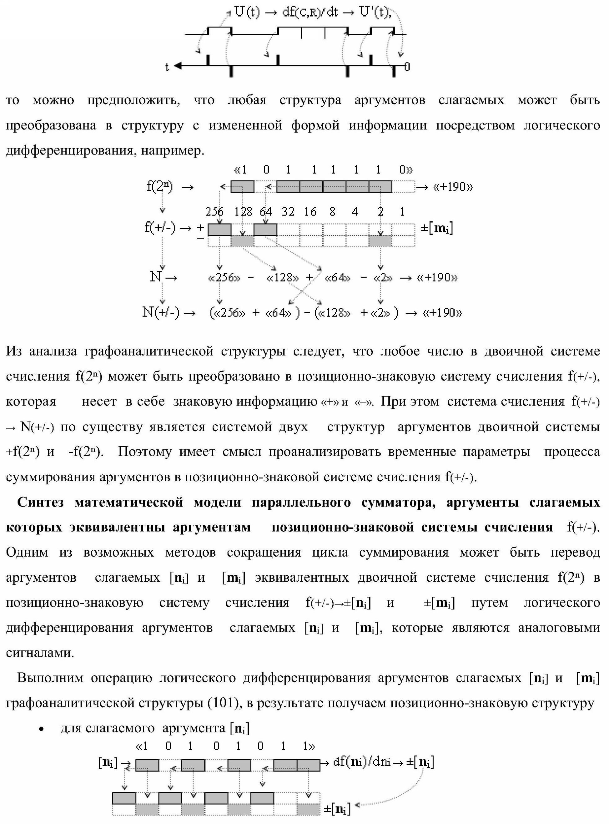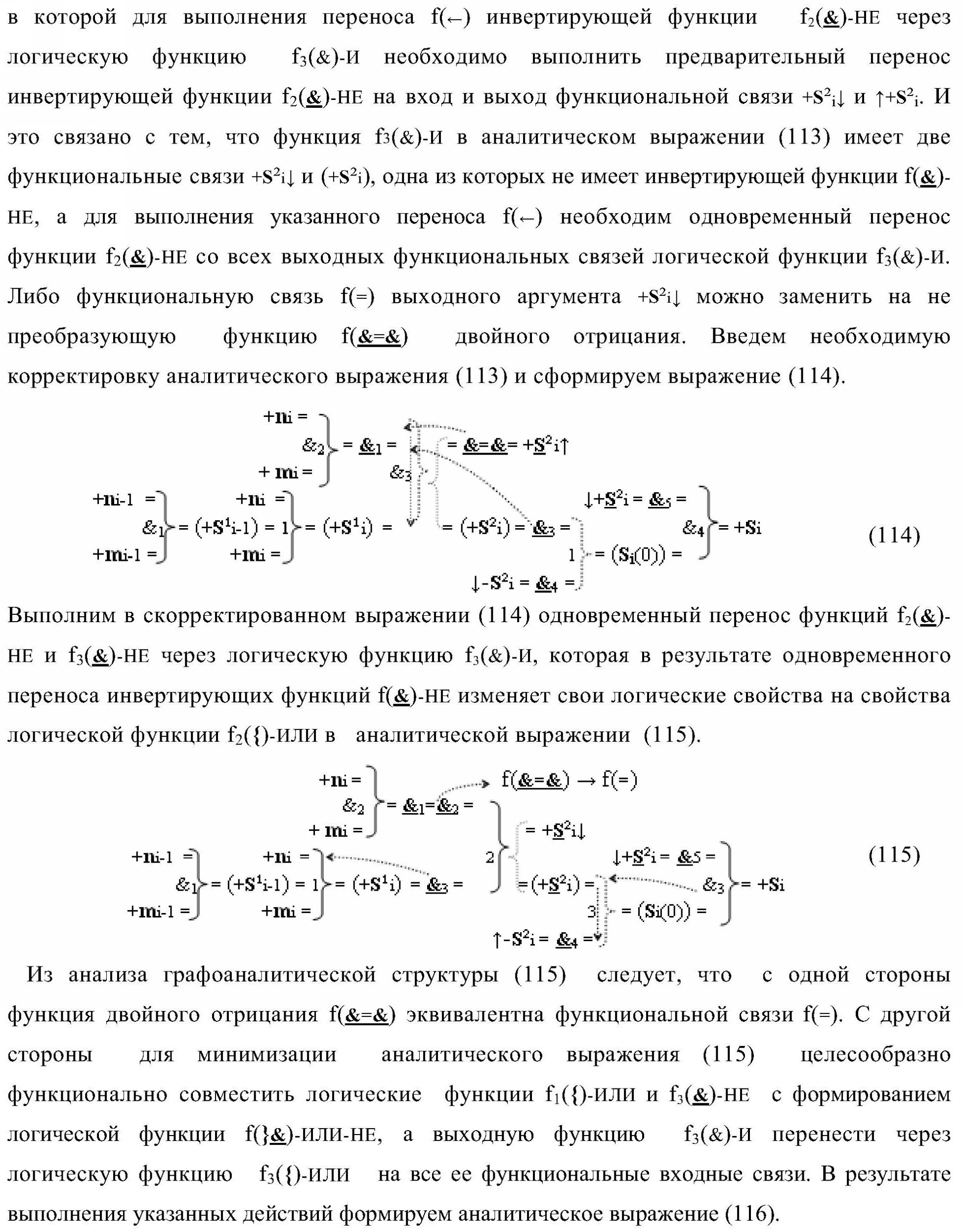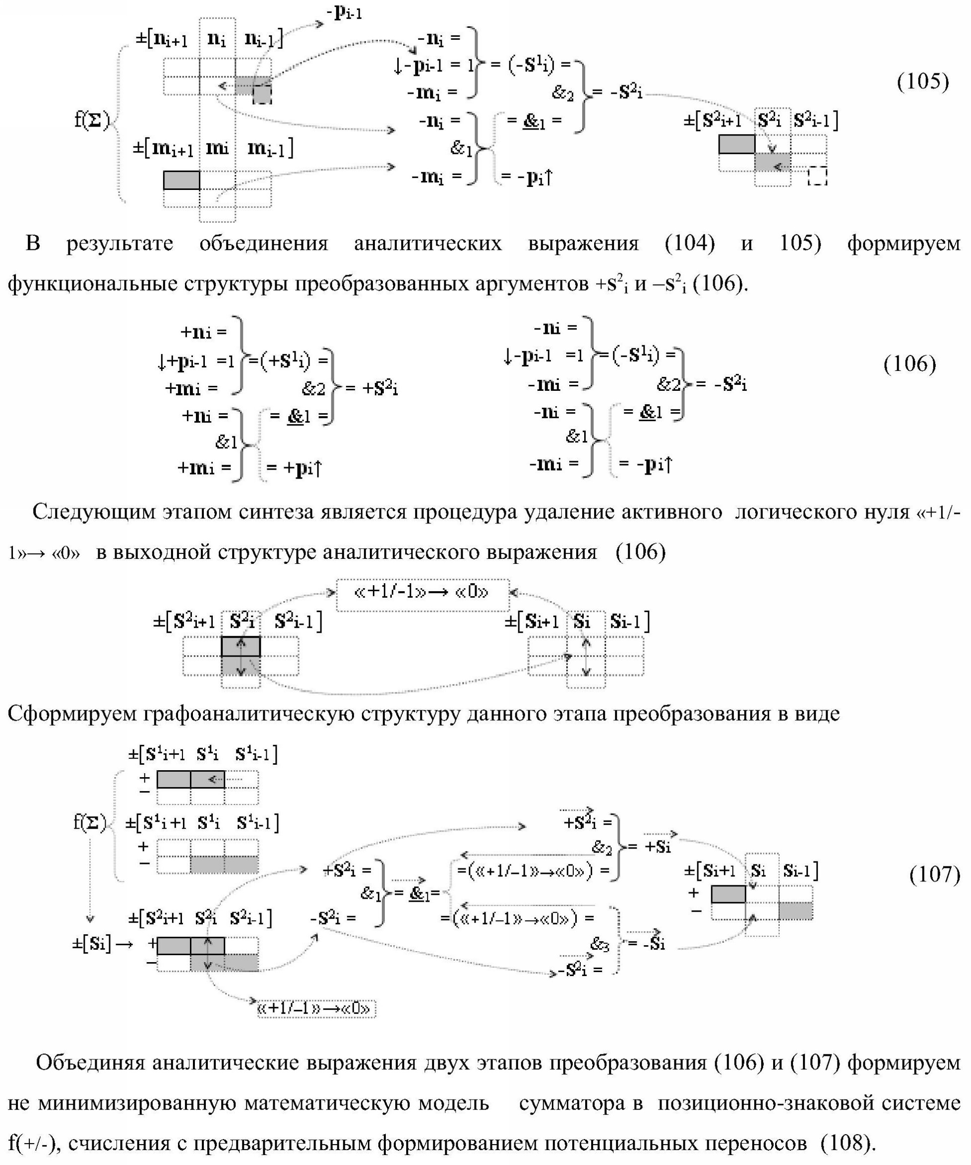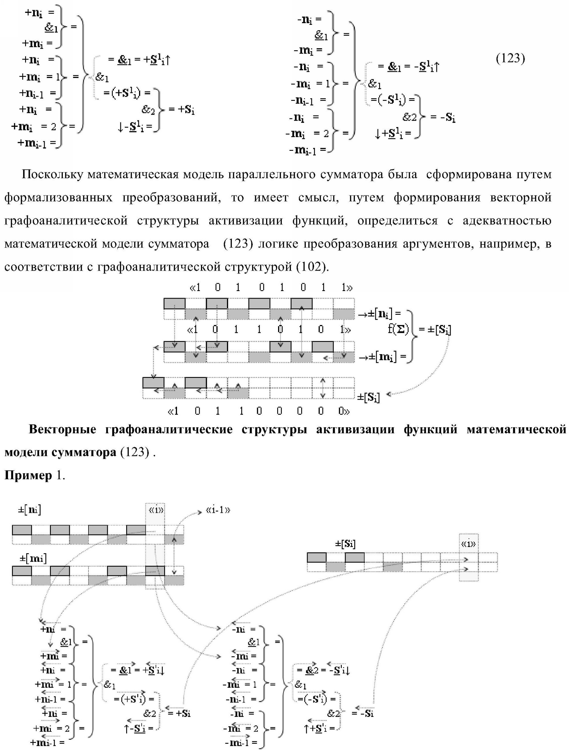 1. Функциональная структура параллельного сумматора для умножителя, в которой условно «i» разряд включает логическую функцию f1(&)-И-HE, в которой две функциональные входные связи являются функциональными входными связями разряда для приема аргументов слагаемых ni и mi, a функциональная выходная связь является выходной функциональной связью разряда для формирования аргумента второй промежуточной суммы S2 i с измененным уровнем аналогового сигнала и является первой функциональной входной связью логической функции f1(&)-И и включает логическую функцию f1(})-ИЛИ, а также включает логическую функцию f2(&)-И, в которой функциональные входные связи являются функциональными выходными связями логических функций f3(})-ИЛИ и f4(})-ИЛИ, отличающаяся тем, что условно «i» разряд структуры параллельного сумматора выполнен в виде положительного и условно отрицательного канала для формирования аргумента положительной суммы +Si и аргумента условно отрицательной суммы -Si, при этом в положительный канал введены логические функции f2(})-ИЛИ, f2(&)-И-НЕ, а в условно отрицательный канал введены логические функции f3(&)-И-НЕ и f4(&)-И-НЕ, при этом функциональные связи логических функций в структуре сумматора выполнены в соответствии с математической моделью вида