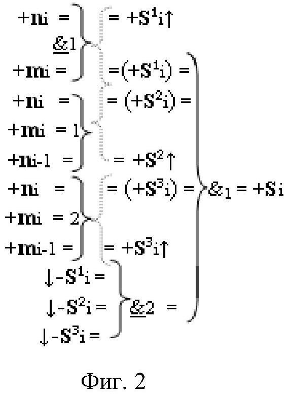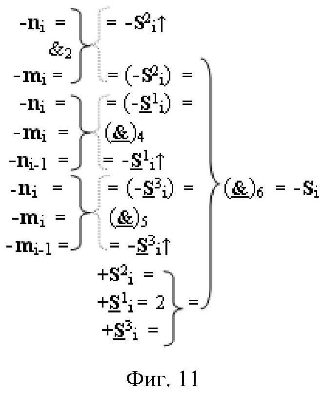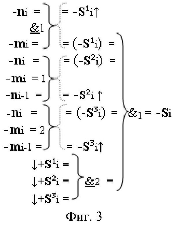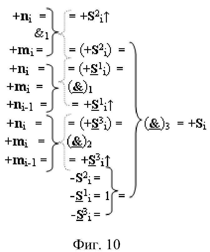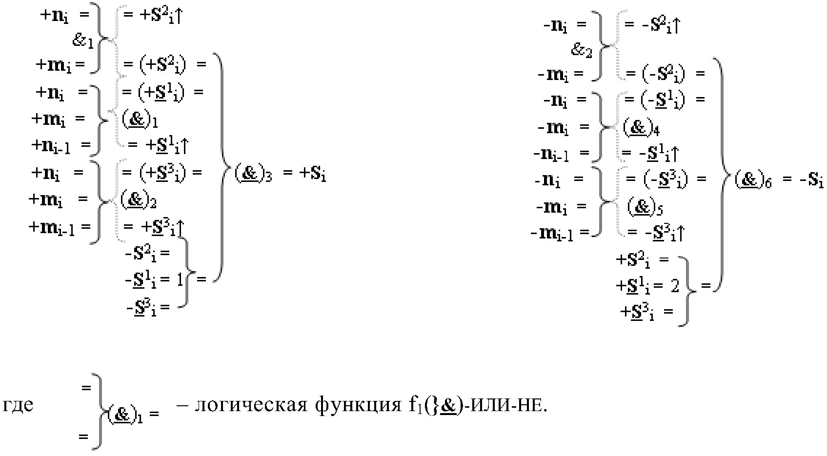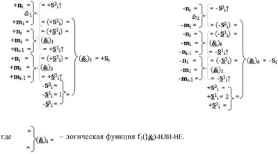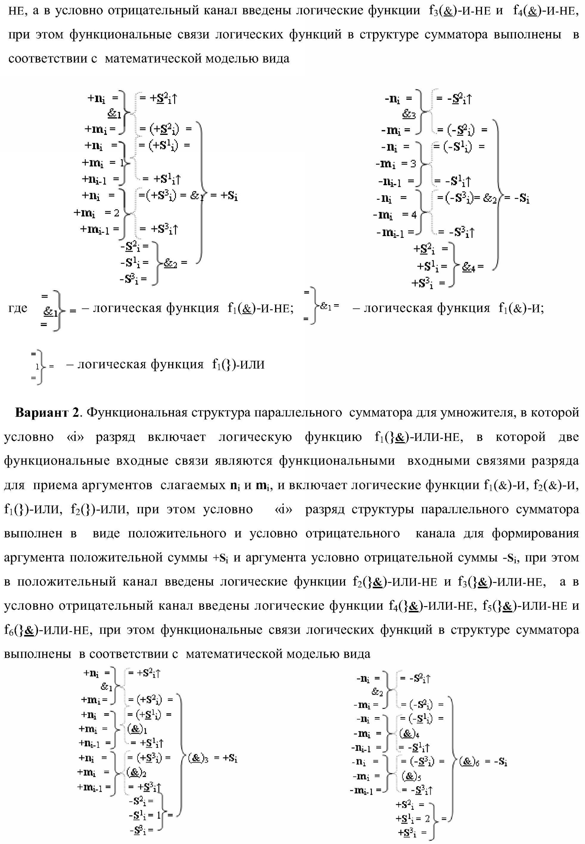 2. Функциональная структура параллельного сумматора для умножителя, в которой условно «i» разряд включает логическую функцию f1(}&)-ИЛИ-НЕ, в которой две функциональные входные связи являются функциональными входными связями разряда для приема аргументов слагаемых ni и mi и включает логические функции f1(&)-И, f2(&)-И, f1(})-ИЛИ, f2(})-ИЛИ, отличающаяся тем, что условно «i» разряд структуры параллельного сумматора выполнен в виде положительного и условно отрицательного канала для формирования аргумента положительной суммы +Si и аргумента условно отрицательной суммы -Si, при этом в положительный канал введены логические функции f2(}&)-ИЛИ-НЕ и f3(}&)-ИЛИ-НЕ, а в условно отрицательный канал введены логические функции f4(}&)-ИЛИ-НЕ, f5(}&)-ИЛИ-НЕ и f6(}&)-ИЛИ-HE, при этом функциональные связи логических функций в структуре сумматора выполнены в соответствии с математической моделью вида