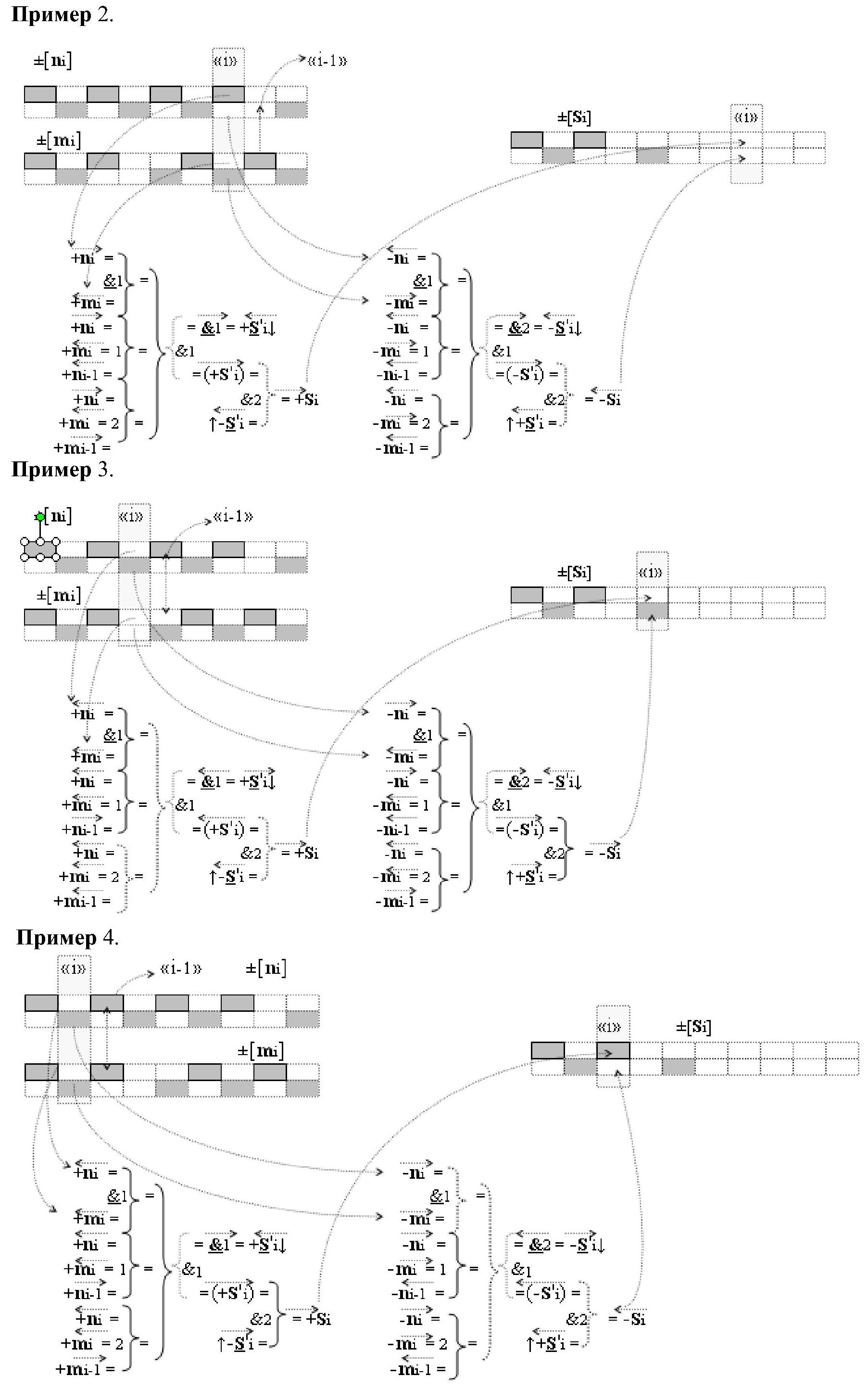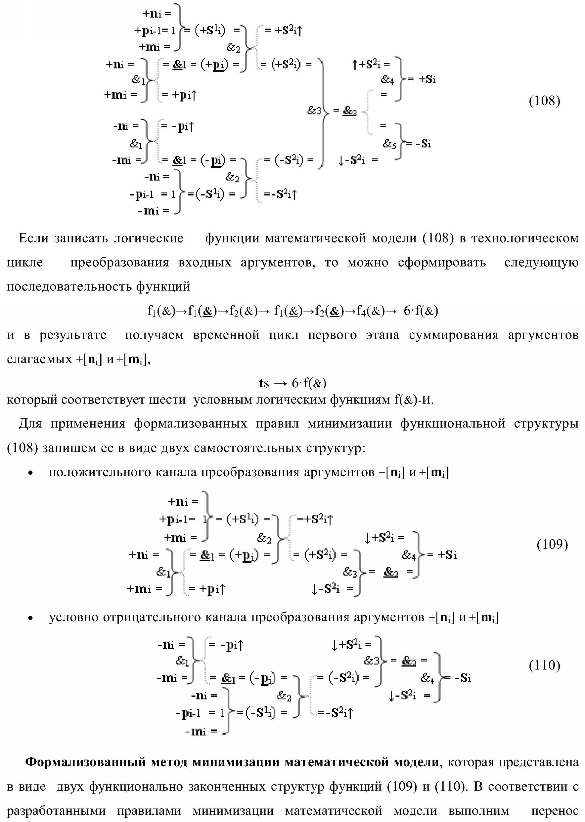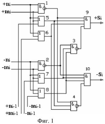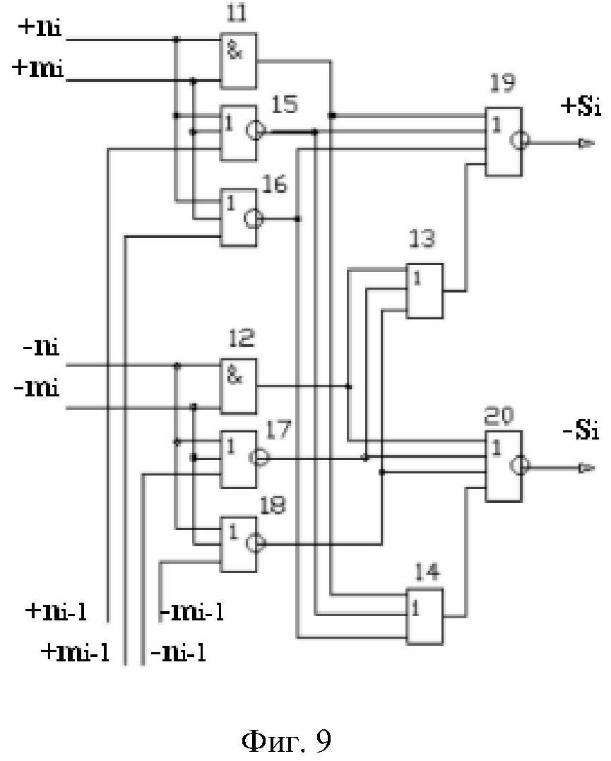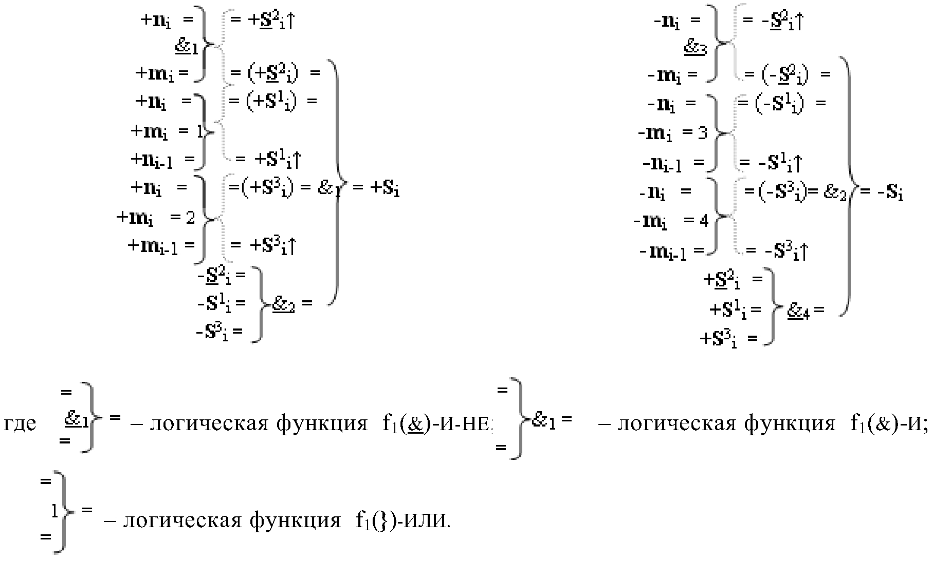 2. Функциональная структура параллельного сумматора для умножителя, в которой условно «i» разряд включает логическую функцию f1(}&)-ИЛИ-НЕ, в которой две функциональные входные связи являются функциональными входными связями разряда для приема аргументов слагаемых ni и mi и включает логические функции f1(&)-И, f2(&)-И, f1(})-ИЛИ, f2(})-ИЛИ, отличающаяся тем, что условно «i» разряд структуры параллельного сумматора выполнен в виде положительного и условно отрицательного канала для формирования аргумента положительной суммы +Si и аргумента условно отрицательной суммы -Si, при этом в положительный канал введены логические функции f2(}&)-ИЛИ-НЕ и f3(}&)-ИЛИ-НЕ, а в условно отрицательный канал введены логические функции f4(}&)-ИЛИ-НЕ, f5(}&)-ИЛИ-НЕ и f6(}&)-ИЛИ-HE, при этом функциональные связи логических функций в структуре сумматора выполнены в соответствии с математической моделью вида