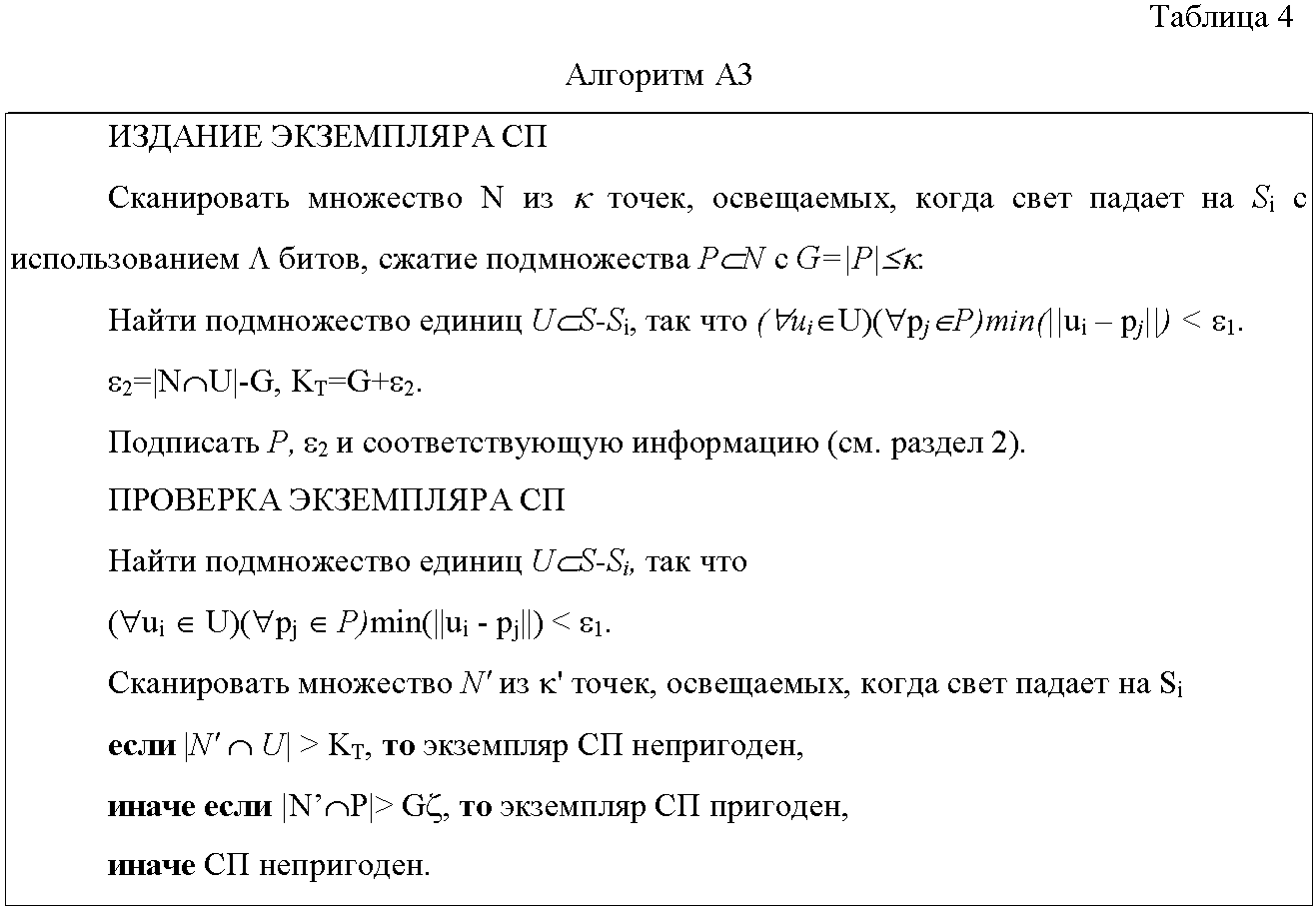 Блоки издания и проверки сертификата подлинности повторяют свои части алгоритма А3 для каждого квадранта Si объекта аутентификации. Блок издания первоначально сканирует экземпляр объекта аутентификации и собирает информацию о множестве точек N, освещаемых, когда Si освещен. Затем, используя имеющиеся битов, он сжимает наибольшее подмножество P N, |P|=G, возвращенное А2. Затем А3 находит подмножество U S-Si, такое, что эвклидово расстояние между каждой единицей ui U и ближайшей к ней единицей pj P не превышает 1. Подмножество U единиц представляет 1-окрестность Р. Затем блок издания подсчитывает количество