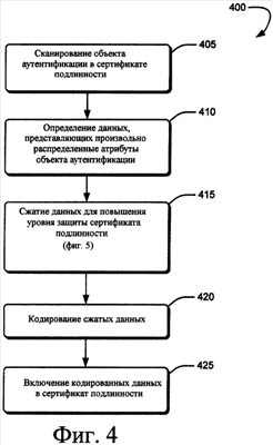 На фиг.4 показана логическая блок-схема иллюстративного процесса 400, который можно использовать для создания сертификата подлинности. В блоке 405 сканируют объект аутентификации в сертификате подлинности. Объект аутентификации можно сканировать с использованием системы 300, показанной на фиг.3А.