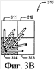 На фиг.3В показан вид сверху объекта 310 аутентификации, показанного на фиг.3А. В ходе работы система 300 сканирования делит объект 310 аутентификации на зоны, например зоны 311-314. Согласно фиг.3В, источник 324 света системы 300 сканирования излучает свет на зону 314, тогда как зоны 311-313 изолированы от источника 324 света. Благодаря освещению зоны 314 оптический датчик 322 может определить местоположение концевых точек в зонах 311-313 объекта 310 аутентификации. Таким образом, считывание произвольно распределенных признаков в объекте 310 аутентификации включает в себя четыре цифровых изображения, которые содержат четыре разных множеств точек. Каждое множество точек связано с конкретной зоной и определяется путем освещения этой зоны.
