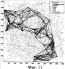 В этом разделе показано, как параметры объекта аутентификации (L,R,K) влияют на производительность алгоритма А.2. На фиг.11 показано решение для одного варианта этой задачи, объекта аутентификации (512,0.4.512,256). Сетка сканирования до L=512 ячеек сканирования. На чертеже описан случай, когда освещен нижний левый квадрант объекта аутентификации. Граф G(N,E), построенный с использованием соответствующих освещенных концевых точек волокна, показан линиями средней толщины. Показаны только десять кратчайших ребер, начинающихся с каждого из = 88 узлов графа. Результирующий путь, показанный на чертеже с использованием толстых линий, состоит из 41 точек. Сумма весовых коэффициентов вдоль ребер пути меньше лимита хранилища: А = 512 бит. Путь сжимается с использованием 12.11 битов на концевую точку волокна (б/ктв). Сохранение данных без сжатия потребовало бы 41.18=738 битов, что дает коэффициент сжатия 0.61. Коэффициент сжатия определяется как отношение размера сжатого сообщения к размеру исходного сообщения.
