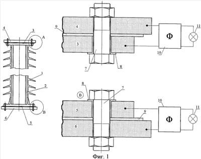 На выноске В фиг.4 показано подключение источника света 11 через фильтр 10 к вторичной обмотке трансформатора тока 12, причем первичная обмотка включена в рассечку цепи продольного тока утечки, образованную изолирующими прокладками 8 и 9. В этом случае первичная обмотка может иметь более одного витка. В обоих случаях фильтр 10 может отсутствовать, а источник света 11 подключаться непосредственно к вторичной обмотке трансформатора тока.