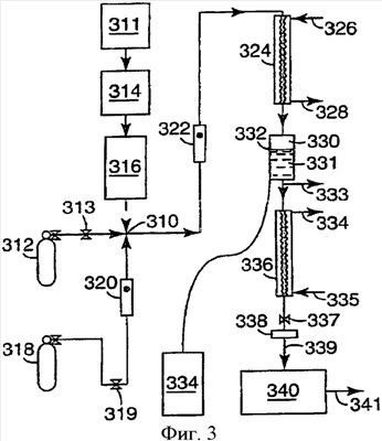 Переключающий клапан 420 может быть установлен, чтобы направлять исходное сырье в колонку 424 с уплотненным слоем, содержащую золотой катализатор, по линии 426 или к обходной линии 428 колонки. Колонка 424 с уплотненным слоем включала все 3,0 г катализатора из Примера 48, содержащиеся в одном и том же держателе 330 катализатора, используемом в тестовой процедуре 2. Колонку 424 с уплотненным слоем можно шунтировать, чтобы сравнить, как обработанное и необработанное исходное сырье влияет на работу МЭС. Увлажнитель 430 пузырьков газа комнатной температуры (~ 23°С точка росы) включен в линию 426, чтобы увлажнять поток исходного сырья из колонки 424 с уплотненным слоем.