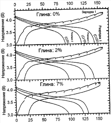 Приведенные выше результаты показывают, что добавление глины оказывает положительное влияние на стойкость при хранении (остаточная и обратимая емкость) литиевых батарей.