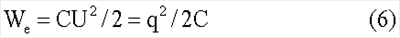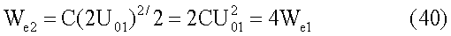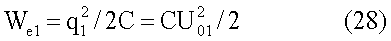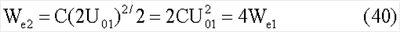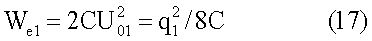 Замыкается ключ S4 и включается ИГ. Пусковой заряд распределяется между параллельно соединенными конденсаторами С1 и С2 пропорционально их емкостям и в контуре устанавливается начальное напряжение U01. Конденсатор С1 приобретает заряд, равный 0,75q1, a конденсатор С2 приобретает заряд 0,25q1. За счет уменьшения энергии электрического поля общая электрическая энергия конденсаторов и контура We1 составит (6)