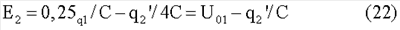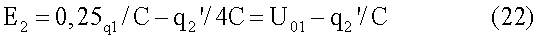 Фактически напряжение начала второго этапа U01 трансформировалось через ИК с конденсатора С1 на конденсатор С2, электрическая энергия которого к моменту равновесия увеличилась с нуля до 0,5CU01 2 за счет уменьшения энергии электрического поля.
