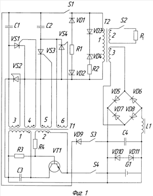 Устройство состоит из силового трансформатора Т2, имеющего сердечник из ферромагнитного сплава с линейной зависимостью магнитной индукции от напряженности магнитного поля в пределах рабочего тока в ГРЭМ. Первичная обмотка трансформатора 1 с индуктивностью L совместно с подключенным через тиристоры VS3, VS4 и ключ S1 основным конденсатором С2 образует колебательный контур, к которому через тиристоры VS1, VS2 подключается дополнительный конденсатор С1. Емкость дополнительного конденсатора составляет 3С, емкость основного конденсатора составляет 1C. Параллельно контуру подключены стабилитроны VD2, VD4 с защищающими диодами VD1,VD3 и шунтирующими резисторами R1, R2.