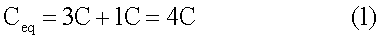 Меньшая емкость (С) является основной, большая емкость (3С) – дополнительной. При таком подключении эквивалентная емкость контура вместо имеющейся емкости 1С составит Ceq, которая равна: