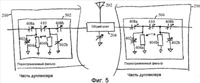 На Фиг.5 показана принципиальная схема иллюстративного варианта осуществления дуплексера и антенны. Дуплексер 210 может включать в себя пару перестраиваемых фильтров 502, 504, конструкция которых описана со ссылкой на Фиг.4. Первый перестраиваемый фильтр 502 может быть подключен между передатчиком 206 и антенной 202, и второй перестраиваемый фильтр 504 может быть подключен между антенной 202 и приемником 208. Перестраиваемые фильтры 502, 504 в дуплексере 210 могут быть подключены к антенне 202 через общий узел 506. Общий узел 506 может включать в себя перестраиваемую цепь согласования импедансов, если антенна не является широкополосной. Цепь согласования импедансов можно реализовать в виде комбинации перестраиваемых низкочастотных и/или высокочастотных фильтров способом, общеизвестным в технике. Эти низкочастотные и/или высокочастотные фильтры могут включать в себя переменные сегнетоэлектрические конденсаторы. Согласно, по меньшей мере, одному варианту осуществления приемопередатчика единое напряжение постоянного тока в качестве сигнала перестройки от процессора можно использовать для перестройки цепи согласования.