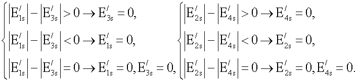 После операции вычитания (72)-(75) в парах взаимно инверсных сигнальных каналов или осуществляют стандартную операцию вычитания величин и : если или , то значение принимается в качестве истинного, а значение заменяется нулем, то есть В противном случае – истинным значением принятого сигнала будет , а значение заменяется нулем. В случае равенства выходных эффектов в этих парах сигнальных каналов их выходные эффекты заменяются нулевыми значениями: