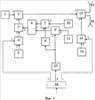 На приемной стороне – последовательно соединенные Г1ПСП2 20 и инвертор 21, выход которого соединен с третьим управляющим входом ПАПр2 22; последовательно соединенные БП7 23, БС1 24 и БВ1 25, выход которого соединен со вторым входом вычислителя 56; последовательно соединенные БП8 26 и БС2 27, выход которого соединен со вторым входом БВ1 25; последовательно соединенные БП9 28, БС3 29 и БВ2 30, выход которого соединен с первым входом вычислителя 56; последовательно соединенные БП10 31 и БС4 32, выход которого соединен со вторым входом БВ2 30; последовательно соединенные БП11 33, БС5 34 и БВ3 35, выход которого соединен с четвертым входом вычислителя 56; последовательно соединенные БП12 36 и БС6 37, выход которого соединен со вторым входом БВ3 35; последовательно соединенные БП13 38, БС7 39 и БВ4 40, выход которого соединен с третьим входом вычислителя; последовательно соединенные БП14 41 и БС8 42, выход которого соединен со вторым входом БВ4 40; первый выход Г1ПСП2 20 соединен с третьим, управляющим входом ПАПр1 19, выход которого соединен с первыми входами БП7 23, БП8 26, БП9 28 и БП10 31, первый сигнальный вход ПАПр1 19 соединен с выходом антенны АПр1 17 и с первым сигнальным входом ПАПр2 22, второй сигнальный вход ПАПр1 19 соединен с выходом антенны АПр2 18 и вторым сигнальным входом ПАПр2 22, выход которого соединен с первыми входами БП11 33, БП12 36, БП13 38 и БП14 41, второй вход которого соединен со вторым выходом БП21 54, первый выход которого соединен со вторым входом БП10 31, второй вход – со вторым выходом ГИМ 50, а первый вход – со вторым входом БП13 38 и выходом БП20 53, первый выход ГИМ 50 соединен со вторым входом БП15 43, первый выход которого соединен со вторым входом БП8 26, второй выход – со вторым входом БП12 36, а первый вход – со вторым входом БП7 23 и выходом БП16 44; первый выход ГНК2 48 соединен с первыми входами БП16 44 и БП17 45, первый выход которого соединен со вторым входом БП9 28, а второй вход – с первым выходом БП19 51, второй выход которого соединен со вторым входом БП20 53, второй вход – с выходом Г2КУ2 52, а первый вход – со вторым выходом Г2ПСП2 49, первый выход которого соединен с первым входом БП18 46, второй вход которого соединен с выходом Г1КУ2 47, первый выход – со вторым входом БП16 44, а второй выход – со вторым входом БП22 55, выход которого соединен со вторым входом БП11 33, а первый вход – со вторым выходом ГНК2 48 и первым входом БП20 53.