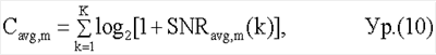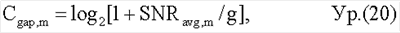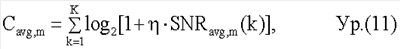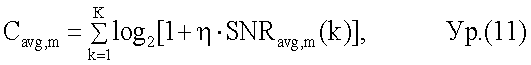 где Cavg,m – средняя емкость каждого пространственного канала для ранга m. В уравнении (10) емкость каждой поднесущей задается в виде log2[1+SNRavg,m(k)]. Емкости для всех К поднесущих затем суммируются для получения средней емкости для ранга m. Функция емкости без ограничений не предполагает потери от кодирования или модуляции.