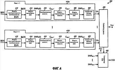 В обрабатывающей секции 410 для ранга m, где m {1, ,Т}, модули 412, 414, 416 и 418 функционируют тем же образом, что и модули 312, 314, 316 и 318 соответственно на фиг.3. Модуль 420 вычисления SNR принимает скорректированную емкость Cadj,m для ранга m и определяет эффективное SNR, например, как показано в уравнении (15). Справочная таблица 422 скорости принимает эффективное SNR для ранга m и предоставляет формат пакета с наибольшей пропускной способностью и требуемое SNR, которое меньше эффективного SNR.