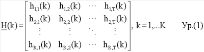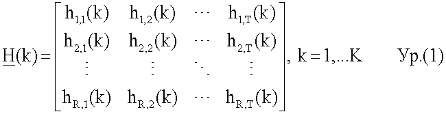где элемент hij(k) для i=1, , R и j=1, , Т является связывающим или комплексным коэффициентом усиления между передающей антенной j и приемной антенной i для поднесущей k.