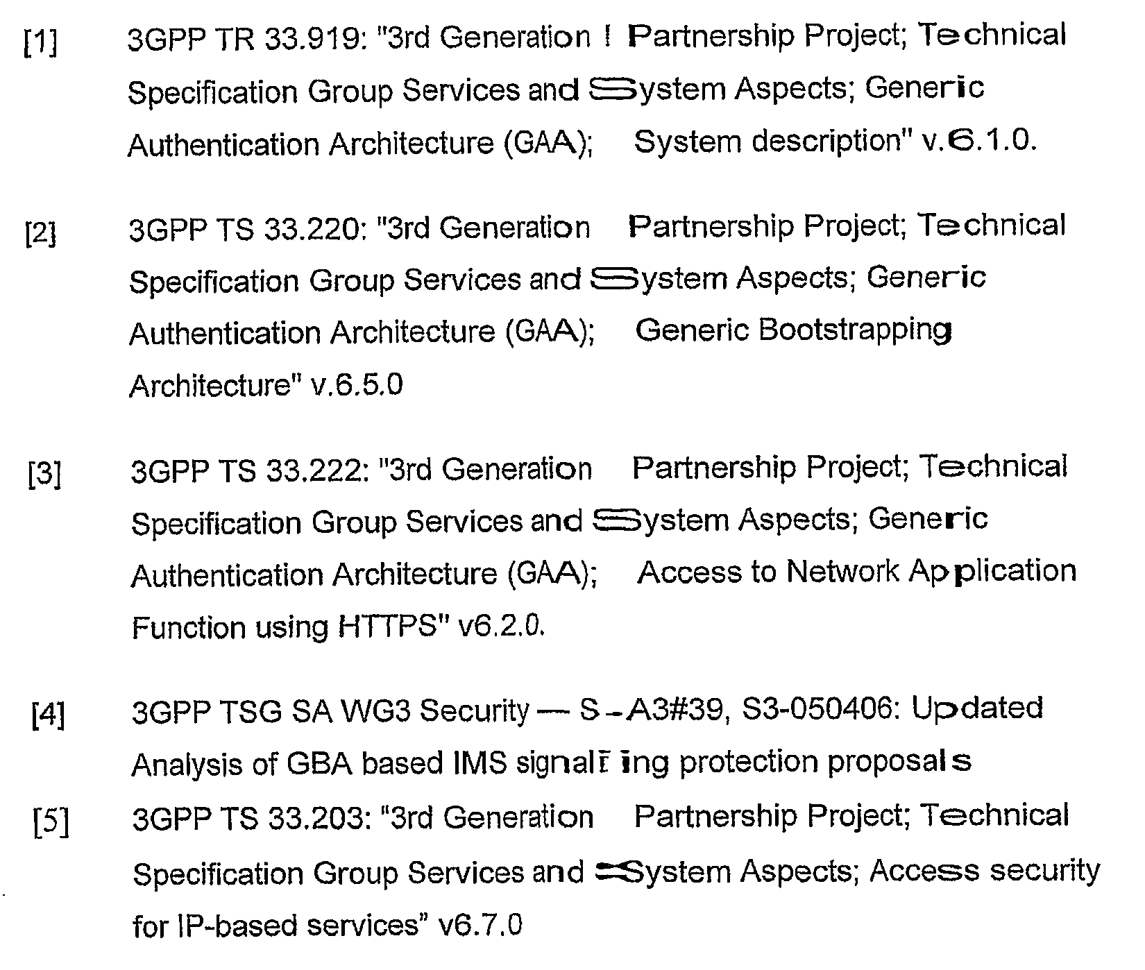 Инфраструктура аутентификации Проекта партнерства по системам 3-го поколения (ПП3П), включающая в себя центр аутентификации (ЦАУ) ПП3П, карту универсального модуля идентификации абонента (УМИА) или модуль идентификации мультимедийных услуг протокола Интернета (ПИ) (МИМУП), и протокол соглашения об аутентификации и ключе (САК) ПП3П, выполняемый между ними, представляют собой очень ценное достояние операторов ПП3П. Было признано, что эта инфраструктура может быть использована на новом уровне, предоставляя возможность функциям приложений в сети и на стороне пользователя устанавливать совместно используемые ключи. Поэтому ПП3П специфицировала «обобщенную архитектуру начальной загрузки» (ОАНЗ), предоставляющую возможность выполнять распределение совместно используемых секретных ключей оборудованию пользователя (ОП) и функции сетевого приложения (ФСП), используя основанные на САК механизмы ([1], [2]). Фиг.1 изображает простую эталонную модель согласно ссылки [2] для начальной загрузки ключей в ФСП и ОП с поддержкой от нового компонента сетевой инфраструктуры, функции сервера начальной загрузки (ФСНЗ) и домашней абонентской системы (ДАС). С ссылкой на фиг.1, блок-схема последовательности операций на фиг.2 объясняет этапы начальной загрузки известного уровня техники. На этапе 210 оборудование пользователя ОП обращается к функции сетевого приложения ФСП по интерфейсу Ua. На этапе 220 определяется, включало ли обращение идентификатор на данные аутентификации, которые уже доступны. Если это так, процесс продолжается на этапе 270. Иначе, на этапе 230, ФСП запрашивает ОП инициировать начальную загрузку, используя способ ОАНЗ для генерирования совместно используемых ключей. ОП перенаправляет запрос на ФСНЗ по интерфейсу Ub. Запрос на начальную загрузку может быть результатом перенаправления по команде от ФСП, как описано здесь, или, иначе, может выполняться до того, как ОП выполнит обращение к ФСП на этапе 210. Конфигурация ОП определяет, какой случай применить. На этапе 240 ФСНЗ запрашивает вектор аутентификации от ДАС по интерфейсу Zh. На этапе 250 ФСНЗ выполняет аутентификацию САК с ОП по интерфейсу Ub, используя вектор аутентификации. Генерируется совместно используемый ключ Ks, и ФСНЗ, кроме того, создает идентификатор B-TID транзакции, который идентифицирует сведения мандата, сгенерированные на ФСНЗ. На этапе 260 идентификатор B-TID передается на ФСП через ОП по интерфейсам Ub и Ua. На этапе 270 ФСП обращается к ФСНЗ по интерфейсу Zn, предоставляя идентификатор B-TID, посредством чего ФСНЗ отвечает соответствующими сведениями мандата. На этапе 280 ФСП отвечает на начальный запрос на этапе 210, включая результат аутентификации.