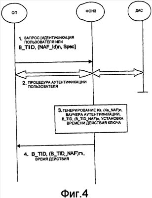 Запрос может включать в себя явно заданные данные идентификации пользователя, например, международный идентификатор мобильной станции (МИМС) или персональный идентификатор мультимедиа ПИ (ПИМП), ссылка [5]. Генерируется по меньшей мере один идентификатор B_TID_NAF, который идентифицирует сгенерированные данные для конкретной ФСП, например, ключ, относящийся к ФСП.