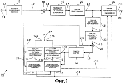 Имея сигналы предсказания, отправленные от секции 14 формирования сигнала межкадрового предсказания и от секции 16 формирования сигнала внутрикадрового предсказания, переключатель 17 решает, какой из сигналов предсказания имеет меньшее отклонение относительно сигнала пикселей целевой области, и выбирает сигнал предсказания с наименьшей ошибкой измерения в соответствии с результатом решения, перед тем как выдать его на вычитатель 18 и сумматор 23. Однако в случаях когда все блоки обрабатываются посредством внутрикадрового предсказания, поскольку для первого кадра предыдущее изображение не существует, переключатель 17 всегда соединен с разъемом 17b секции 16 формирования сигнала внутрикадрового предсказания при обработке первого изображения. Аналогично в случаях когда обрабатывается кадр, непосредственно следующий за изменением сцены, и в случаях когда есть необходимость периодически вставлять изображение с внутрикадровым предсказанием, переключатель 17 также выбирает сигнал предсказания, сформированный посредством внутрикадрового предсказания для целого кадра.