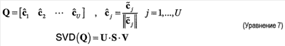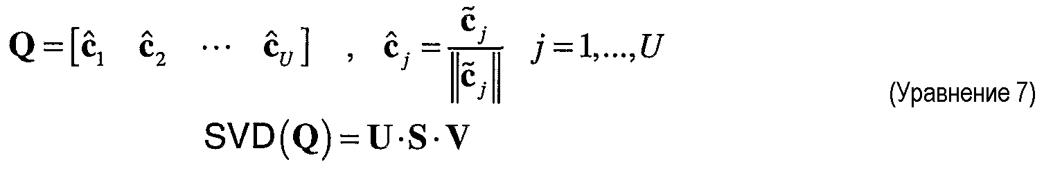 Другой подход, который может быть использован для суммирования различных оценок вектора калибровки, может основываться на суммировании оцененных векторов в матрице. Например, в некоторых аспектах каждая оценка вектора калибровки может представлять собой повернутую и масштабированную версию одного и того же вектора , причем поворот и масштабирование обусловлены различными рассогласованиями u терминала доступа. Одним путем избавления от этого масштабирования и поворота является сначала нормализация каждого вектора калибровки, чтобы он имел единичную норму. Затем матрица Q, столбцы которой представляют собой нормализованные оценки вектора калибровки, может быть сформирована из векторов калибровки. Единственная оценка для вектора калибровки получается посредством выполнения разложения матрицы, например, разложения по сингулярным числам матрицы Q. Собственный вектор, соответствующий максимальному сингулярному числу, может использоваться в качестве общей оценки вектора калибровки, например, как показано в уравнении (7) ниже.