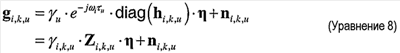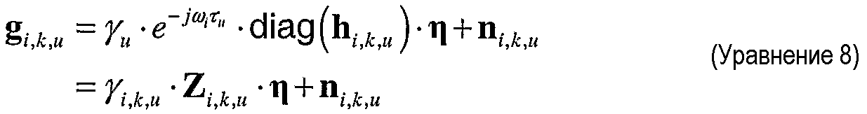 Альтернативой вычислению множества векторов калибровки является использование процедуры совместной оптимизации, использующей множество измерений узлов доступа и терминалов доступа следующим образом. В некоторых случаях терминал доступа и узел доступа могут генерировать свои оценки канала для различных частотных тонов и в различные моменты времени. Кроме того, может быть временная ошибка k,u между узлом доступа и u-ым терминалом доступа в момент k времени. В таком случае, оценка gi,k,u вектора канала прямой линии связи, измеренная на терминале доступа, может быть связана с оценкой hi,k,u вектора канала обратной линии связи, измеренной в узле доступа. Один подход, использующий вектор калибровки и рассогласование u терминала доступа, изображен в уравнении (8) ниже.