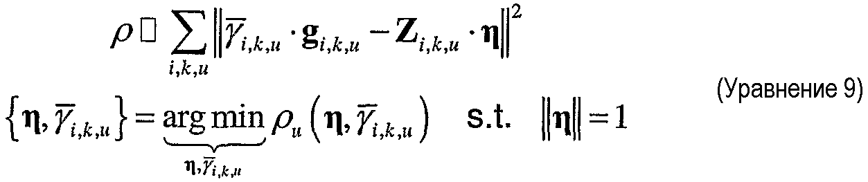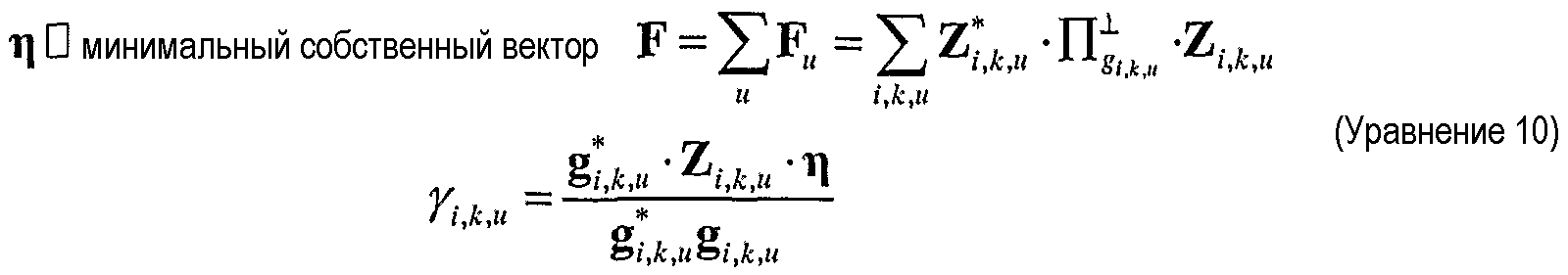 В уравнении (8) Zi,k,u представляет собой диагональную матрицу, диагональные элементы которой представляют собой элементы оценки hi,k,u вектора канала обратной линии связи и . Нижние индексы i,k,u представляют собой индексы тона, времени и пользователя, соответственно. В вышеупомянутом уравнении неизвестными являются вектор калибровки и конкретное рассогласование i,k,u терминала доступа. Особенность уравнения (8) заключается в том, что рассогласование терминала доступа включает в себя эффект временного рассогласования между узлом доступа и терминалом доступа в дополнение к рассогласованию усиления из-за каналов передачи и приема терминала доступа. Одним путем получения решения для и i,k,u является использование подхода минимальной среднеквадратической ошибки (МСКО), как показано в уравнении (9).