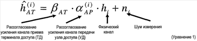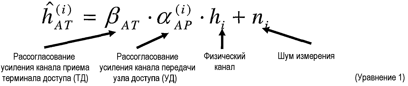 В уравнении (1) оценка канала представляет собой функцию рассогласования AT усиления канала приемника терминала доступа, рассогласования усиления канала передатчика узла доступа, hi, который представляет собой физический канал между двумя измеряемыми антеннами, и шума ni канала, который представляет собой часть оценки канала.