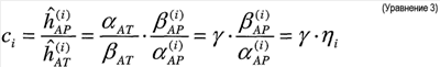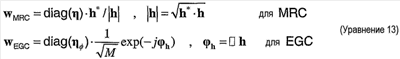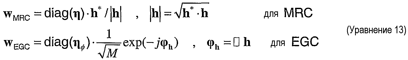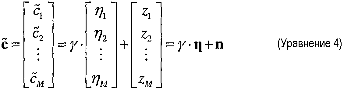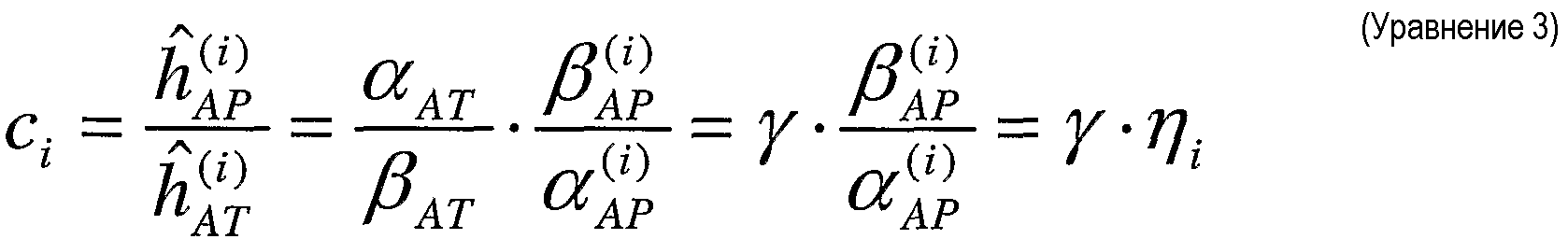 В уравнении (3) ci представляет собой общее отношение рассогласования между передачами по обратной линии связи и передачами по прямой линии связи, представляет собой отношение рассогласования усилений между каналами передачи и приема терминала доступа, и i представляет собой отношение рассогласования каналов приема и передачи для i-ой антенны в узле доступа. Необходимо отметить, что , по существу, является постоянным для каждой пары антенн в узле доступа. Также в некоторых отношениях уравнение (3) является идеализированным, так как оценка шума не включена в него.