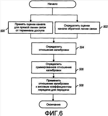Фиг.6 иллюстрирует метод для калибровки антенной решетки для передачи. Оценки канала для прямой линии связи принимаются от терминалов доступа (блок 500). Как описано выше, эти оценки канала могут генерироваться из пилот-сигналов прямой линии связи, переданных узлом доступа. Кроме того, оценки канала для информации об обратной линии связи, например, пилот-сигналов канала обратной линии связи, генерируются узлом доступа (блок 502).