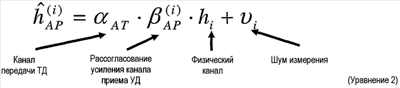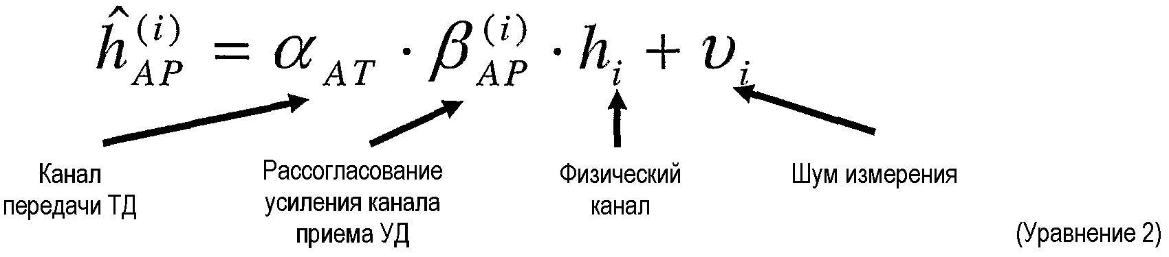 В уравнении (2) эта оценка канала представляет собой функцию рассогласования AT усиления канала передачи терминала доступа, рассогласования усиления канала приемника узла доступа, hi, который представляет собой физический канал между двумя измеряемыми антеннами, и шума i канала, который представляет собой часть оценки канала.