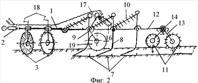 Рама 1 плоская с продольными поперечными брусьями: к переднему брусу присоединяется сница 2 и снизу рабочие органы, два ряда дискаторов 3 и три ряда лап 7, над ними расположены наклонные пружины 10 и штанги, соединенные с вертикальной стойкой 8 через шарнир 9, к заднему брусу крепится поводок 12 секции вращающихся рабочих органов от почвы, кроме того, над рамой 1 расположен гидроцилиндр 16, связанный с механизмом подъема 17 опорных колес 19. Дискаторы 3 выполнены в двух вариантах: первый снабжен волнистыми дисками, а второй – зазубренными дисками. Конструктивная особенность агрегата заключается в том, что к поводкам 12 рамы 1 присоединяется ось 14 секции вращающихся рабочих органов с горизонтальной пружиной 15 вертикального действия. Она одним концом присоединена к поводкам 12 рамы 1, а другим – к наклонным стойкам 13. Для регулирования положения дисков 4 и 5 в пространстве и относительно линии движения и плоскости подреза каждый дискатор 3 снабжен механизмом 18 регулирования.