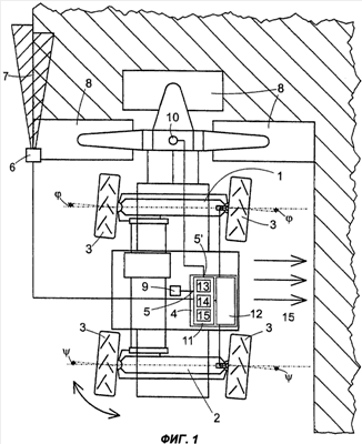 Кроме того, датчик 9 наклона соединен с входом 5 модуля 14 определения угла поворота колес. Такой датчик 9 наклона может, например, содержать частично заполненные жидкостью сосуды и датчики для оптического или механического восприятия положения зеркала поверхности жидкости в сосудах. Подходящим является также заполненный электропроводной жидкостью сосуд с несколькими погруженными в жидкость электродами. В этом случае электрическое сопротивление жидкости между электродами изменяется в зависимости от положения зеркала поверхности жидкости. Примеры выполнения таких датчиков 9 наклона подробно описаны в патентном документе ФРГ 19914726 А1 и в упомянутых в нем документах.