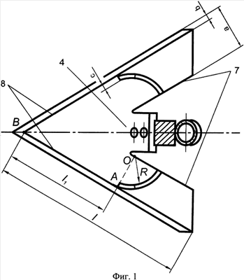 Устройство состоит из дугообразной стойки 1, семяпровода 2 и стрельчатой лапы 3, состоящей из груди 4 и двух крыльев 5 с открылками 6. Каждый открылок 6 выполнен изогнутым в виде дуги окружности с радиусом R=а-b-с, где а – ширина крыла сошника, b – ширина верхней заточки сошника, с – толщина открылка, с центром О, расположенном на линии заднего обреза 7 крыла 5, кроме того, задняя часть открылка выполнена высотой где Н – глубина хода сошника, а передняя часть открылка выполнена со скосом под угол = , где – угол трения почвы о стальную поверхность открылка. При этом передняя часть каждого открылка 6 установлена в точке А, расположенной на ребре перехода 8 верхней заточки 9 в наклонную поверхность крыла 5 и отстоящей от точки пересечения В ребер 8 обоих крыльев 5 на расстоянии l1=0,5·l, где l – длина ребра перехода 8, а задняя часть открылка 6 установлена на линии заднего обреза 7 крыла 5 таким образом, что линия проведенная через точки О и А образует перпендикуляр к линии заднего обреза 7 крыла 5.