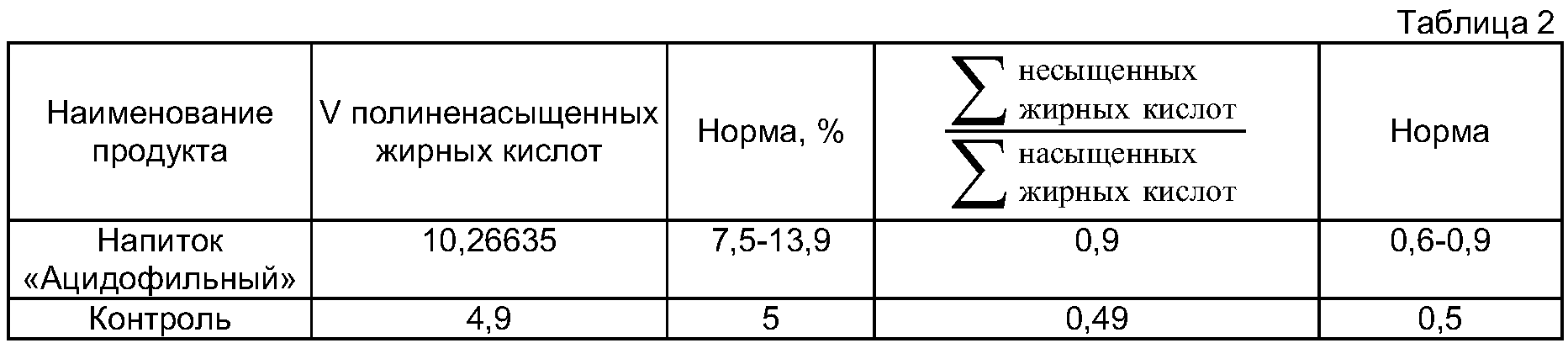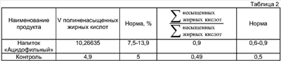 В табл.1 приведен жирно-кислотный состав кисломолочного напитка «Ацидофильный» по сравнению с контролем, в качестве которого выступал кисломолочный напиток с чистым молочным жиром.