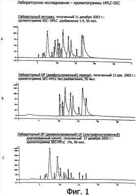 Фиг.1А-С представляют собой HPLC хроматограммы профилей образцов, полученных, начиная с экстракции в лабораторных условиях и кончая производством готового изолята белка канолы.