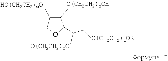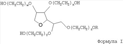 В этом контексте пищевой эмульгатор (или «эмульгатор, одобренный для применения в пищевой промышленности») относится к соединению, детергенту, эмульгатору или стабилизатору, допущенному в качестве добавки к пище или добавки к пищевому продукту. В применении согласно настоящему изобретению предпочтительные пищевые эмульгаторы включают в себя производные сорбитана формулы I