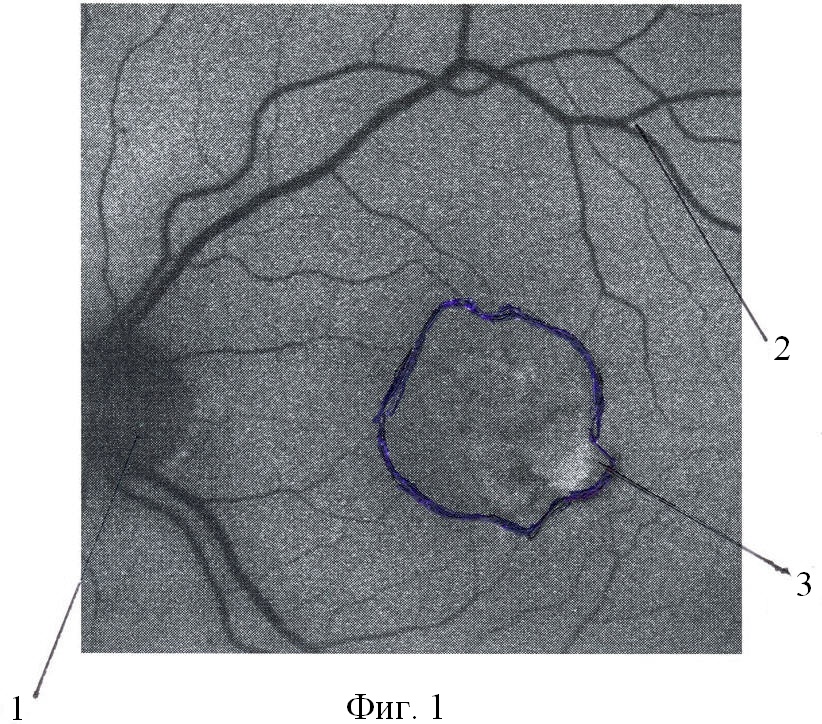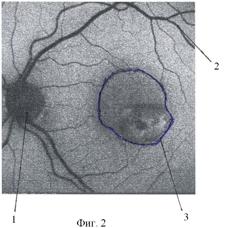 Предложенный способ осуществляется следующим образом. Первоначально возбуждают аутофлюоресценцию с помощью маломощного сине-зеленого аргонового лазера с длиной волны 488 нм. Барьерным фильтром выделятся свечение флюорохромов с длиной волны более 500 нм. Дополнительно используется интерференционный фильтр, подавляющий зеленую составляющую спектра возбуждающего лазера 514 нм и еще один интерференционный фильтр, подавляющий отражения от глазного дна возбуждающего излучения 488 нм. Далее определяют параметры аутофлюоресценции сетчатой оболочки: фиксируют сниженную аутофлюоресценцию диска зрительного нерва 1 (Фиг.1), сниженную аутофлюоресценцию сосудов сетчатой оболочки 2 (Фиг.1), повышенный уровень аутофлюоресценции клеток ретинального пигментного эпителия 3 (Фиг.1). Обводим контур зоны повышенной аутофлюоресценции и измеряем площадь этой зоны, которую обозначаем как площадь S1. Далее через интервал времени 3-6 месяцев проводят дополнительное исследование. Аналогично фиксируют сниженную аутофлюоресценцию диска зрительного нерва 1 (Фиг.2), сниженную аутофлюоресценцию сосудов сетчатой оболочки 2 (Фиг.2), повышенный уровень аутофлюоресценции клеток ретинального пигментного эпителия 3 (Фиг.2). Обводим контур зоны повышенной аутофлюоресценции и измеряем площадь этой зоны, которую обозначаем как площадь S2.